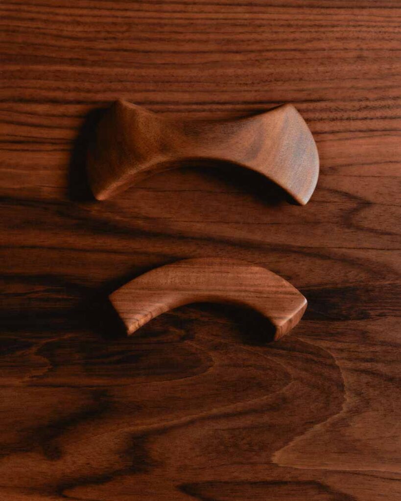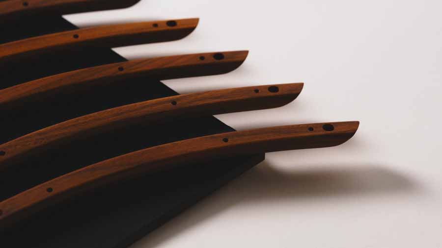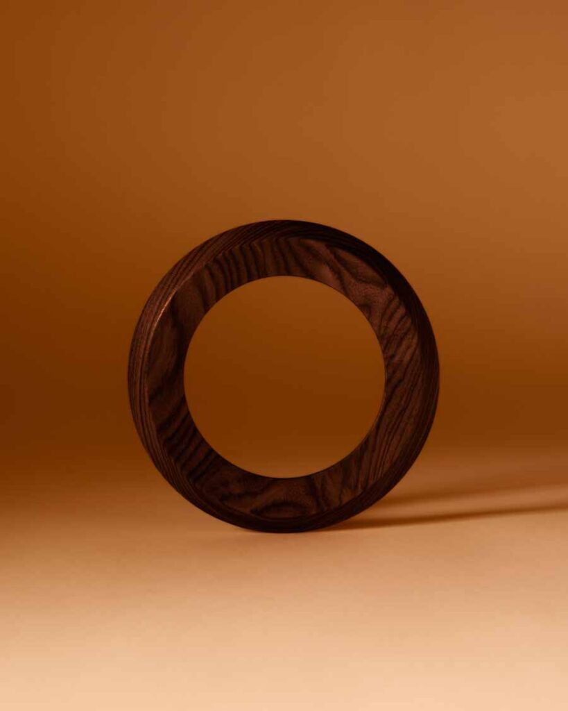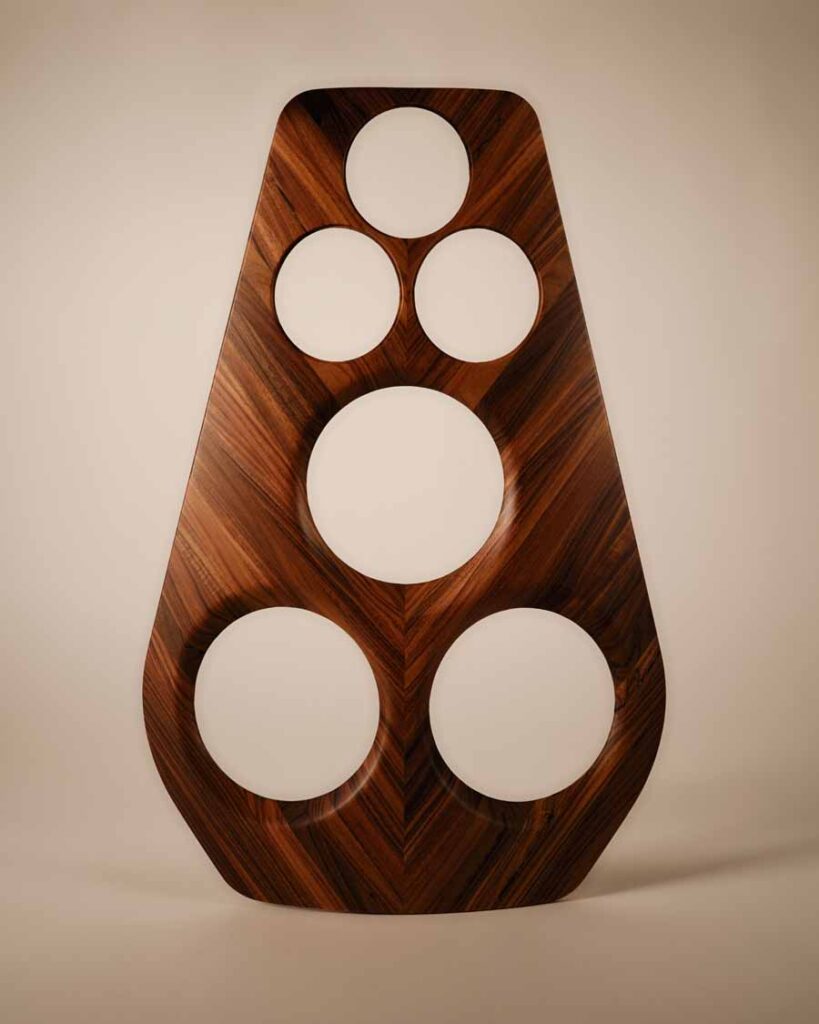 The Beolab 90 Monarch Edition focuses on the use of rosewood and aluminium to create a layered exterior structure. Angled rosewood lamellas wrap around the cabinet, forming a continuous pattern that extends from top to base. These are joined by six visible wooden connection points, including a front detail incorporating a light-through-wood element.