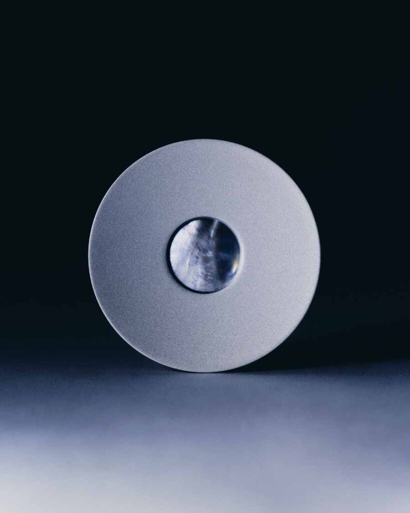 Additional elements include a pearl-blasted aluminium facemask in a dark grey finish and a circular mother-of-pearl inlay on the top surface. The panels are shaped to follow the speaker’s geometry, integrating decorative and structural elements while maintaining access to the acoustic components behind semi-transparent fabric sections.