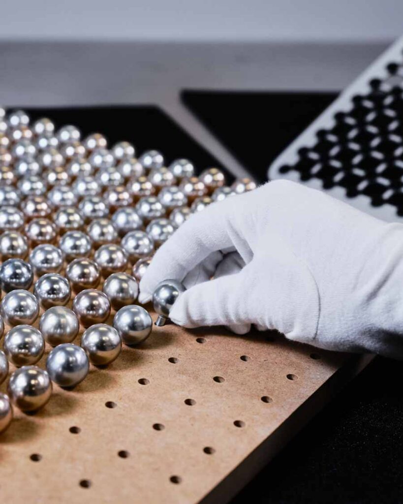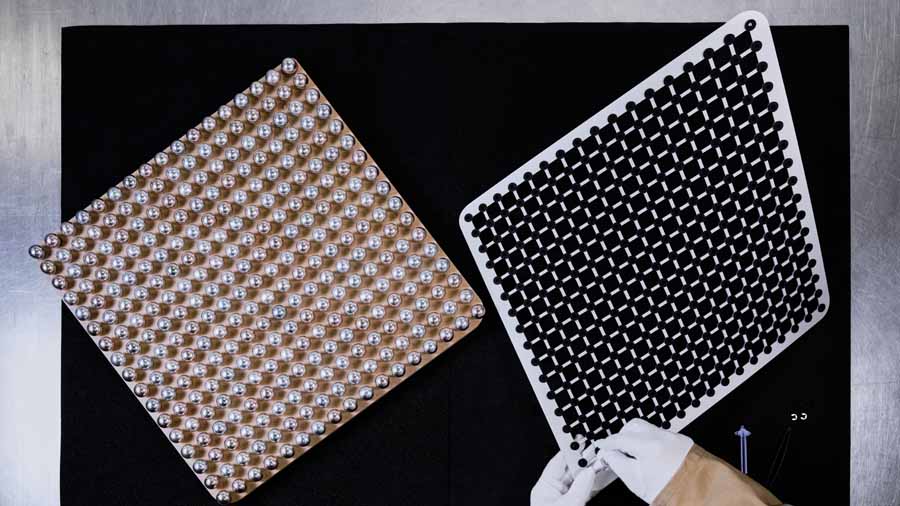 The Beolab 90 Zenith Edition takes a different approach, using aluminium spheres and surface finishes to create a reflective exterior. Each speaker features six panels, with 289 anodised aluminium spheres per panel arranged in multiple colour tones.