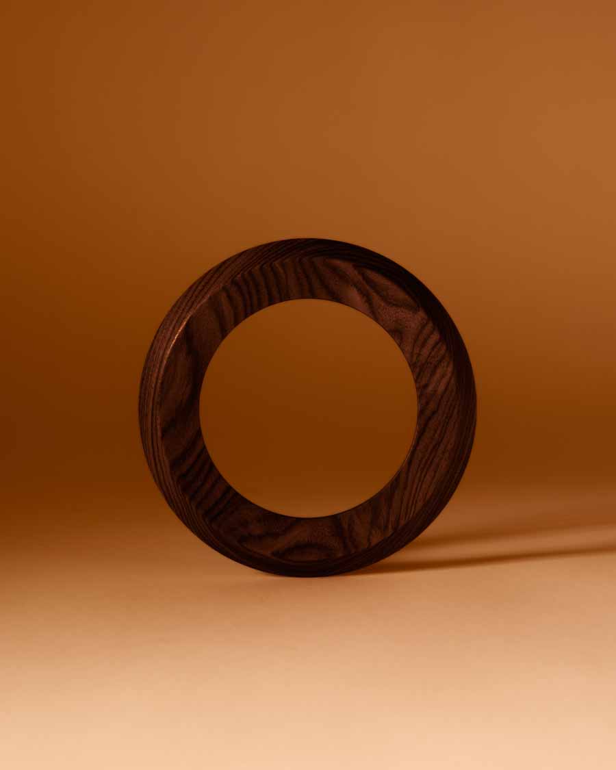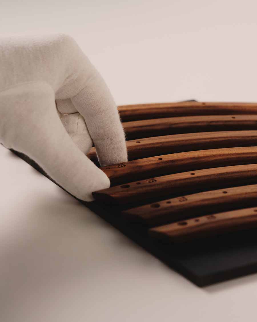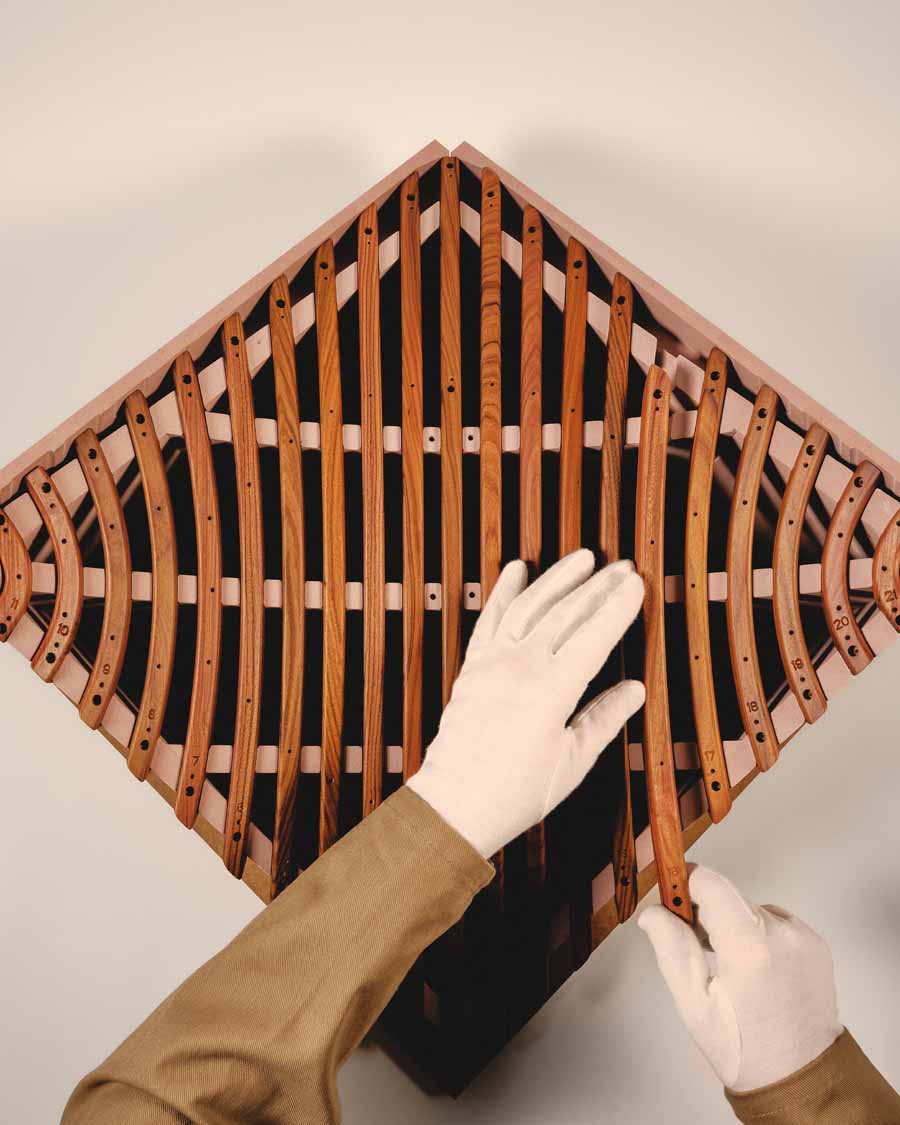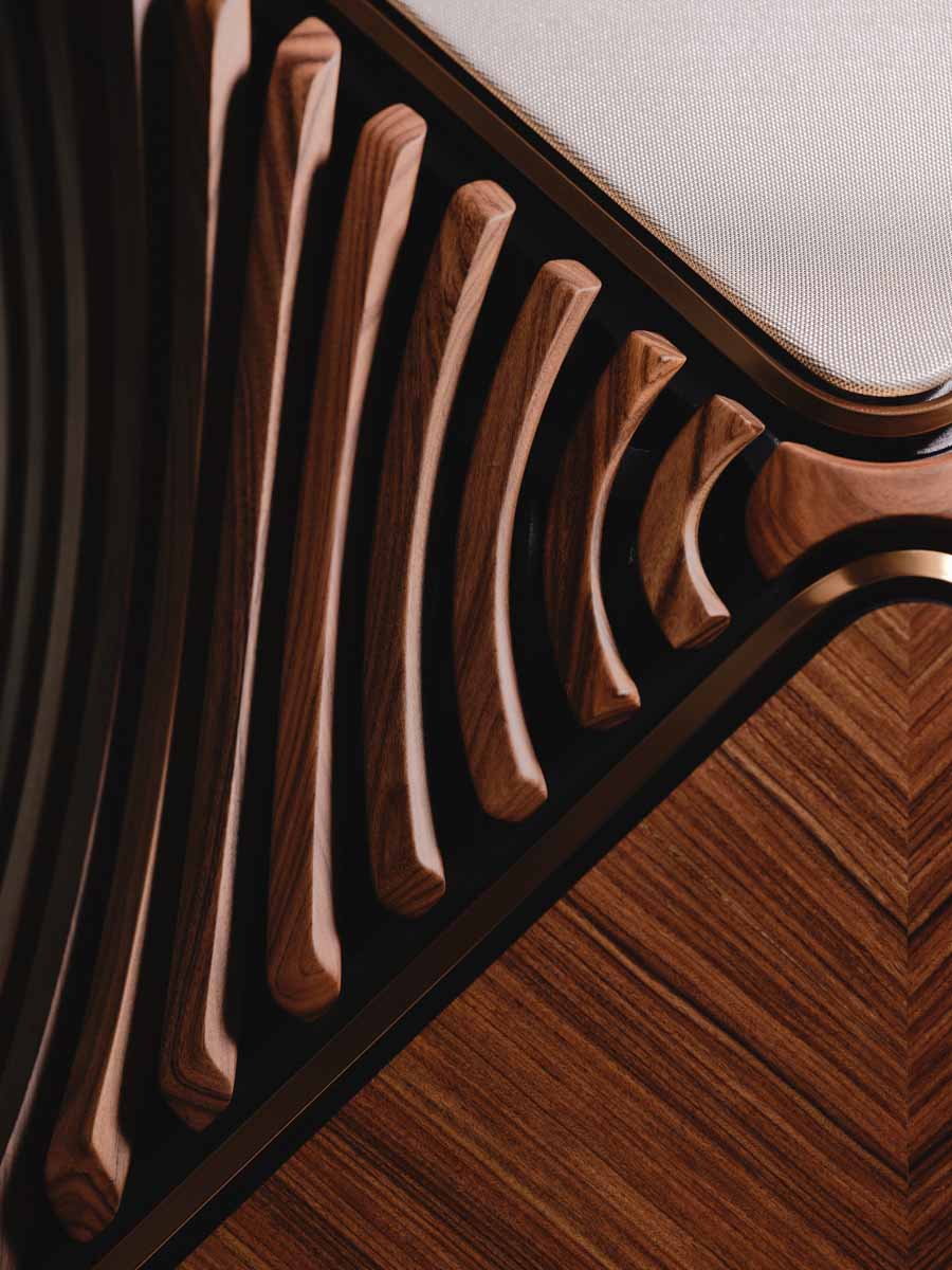 The Beolab 90 Monarch Edition focuses on the use of rosewood and aluminium to create a layered exterior structure. Angled rosewood lamellas wrap around the cabinet, forming a continuous pattern that extends from top to base. These are joined by six visible wooden connection points, including a front detail incorporating a light-through-wood element.