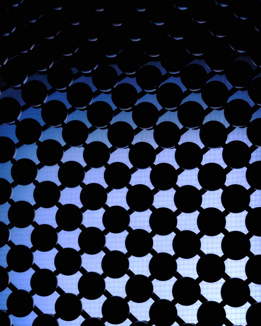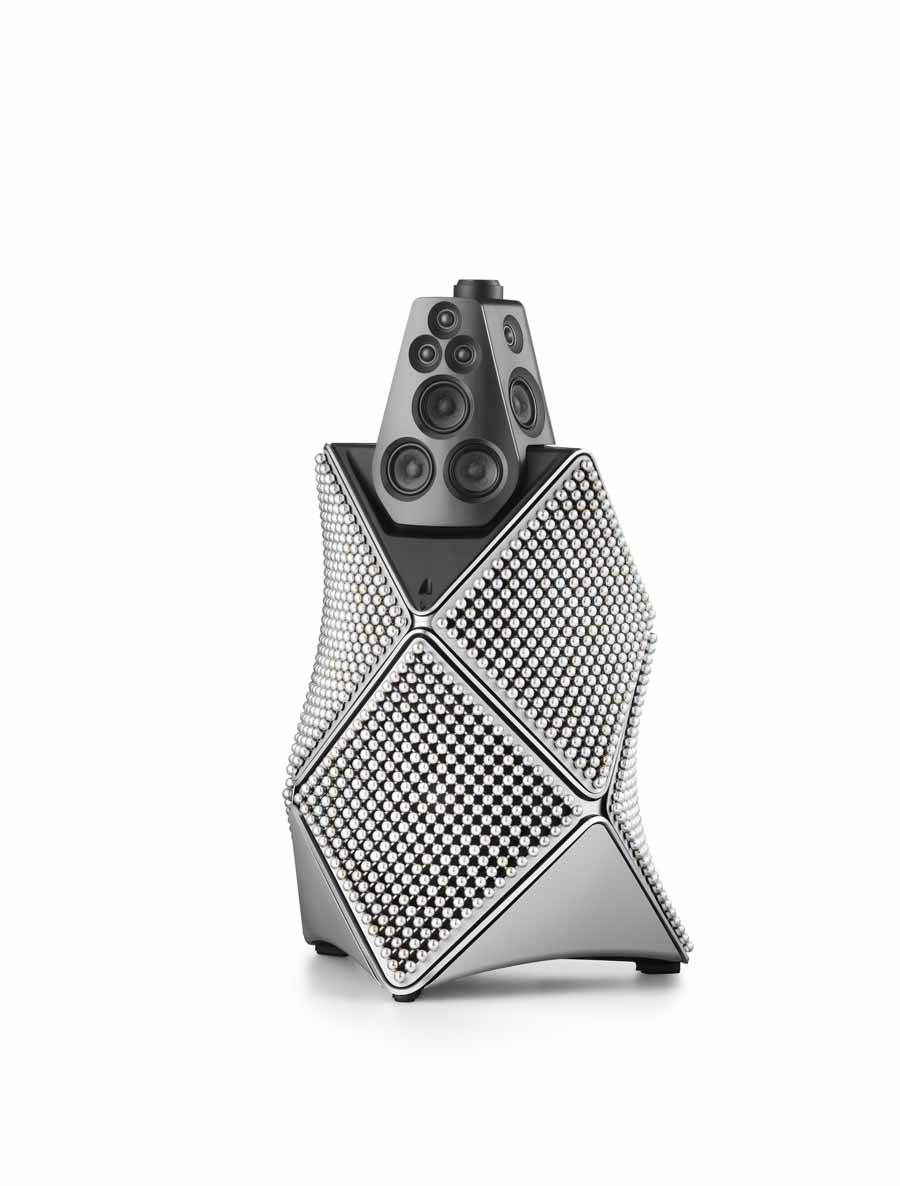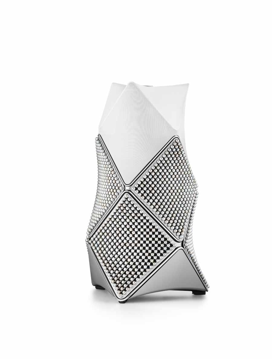 The Beolab 90 Zenith Edition takes a different approach, using aluminium spheres and surface finishes to create a reflective exterior. Each speaker features six panels, with 289 anodised aluminium spheres per panel arranged in multiple colour tones.