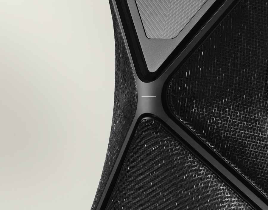 Bang & Olufsen has integrated hand-layered carbon fibre across the Phantom Edition’s shoulder plates, sculptural face mask and base panels. This material choice introduces a motorsport-inspired aesthetic while reducing weight and adding rigidity.