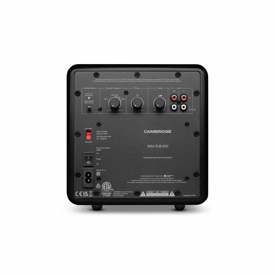 Low-frequency duties in the Cambridge Audio MSX system are handled by two subwoofers. The MSX Sub 200 features a 200-watt amplifier, a 6.5-inch active driver, and dual Auxiliary Bass Radiators (ABRs). The MSX Sub 300 increases output with a 300-watt amplifier and an 8-inch driver in a larger enclosure.