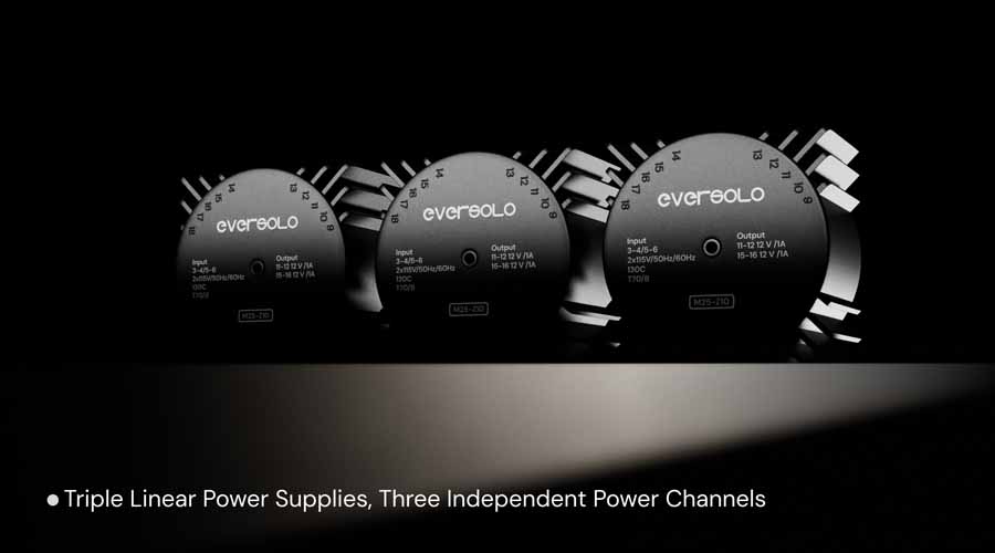 The internal layout includes three independent linear power supplies, dedicated to the left channel, right channel, and system circuitry. Each supply is isolated from the others to support consistent performance and minimise electrical noise.