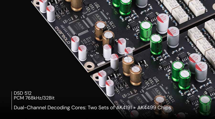 The DAC section uses separate AK4191 and AK4499 chipsets for each channel. This dual-mono decoding approach is intended to prevent crosstalk and maintain channel separation during high-resolution playback, including DSD512 and PCM up to 768kHz/32-bit.