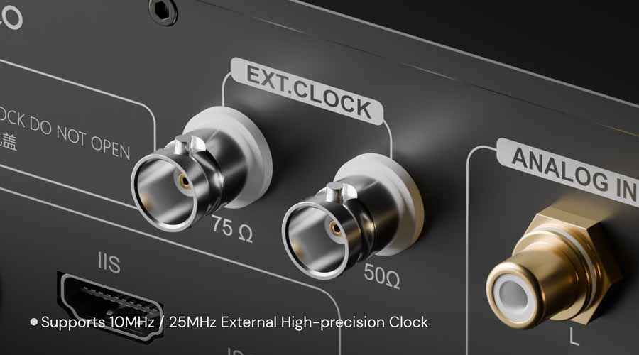 Clock management is handled by the Eversolo Precision Core system, combining a temperature-controlled OCXO oscillator, PLL processing, and FPGA-based clock reconstruction. The DAC-Z10 also supports external 10MHz and 25MHz clock inputs with selectable 50Ω and 75Ω impedance options.