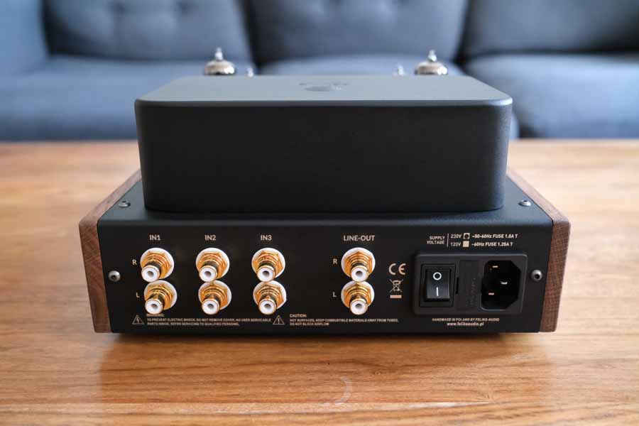 Feature-wise, you have 2 x 6N6P power valves and 2 x 6N1P driver valves. The 6N1P can easily be replaced by 6DJ8/ECC88/6922 variants, which give you plenty of valve rolling opportunities. On the power side, you are a little limited to other 6N6P or 6N6P-I variants (Foton’s square getter tubes are supposed to be very good here). The Echo Vibe has 3 inputs and one pre-out, allowing you to use the amp as a valve pre-amplifier in your system of choice.