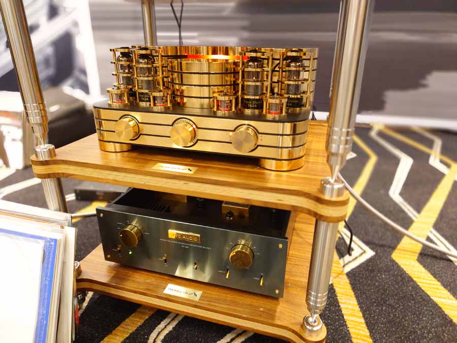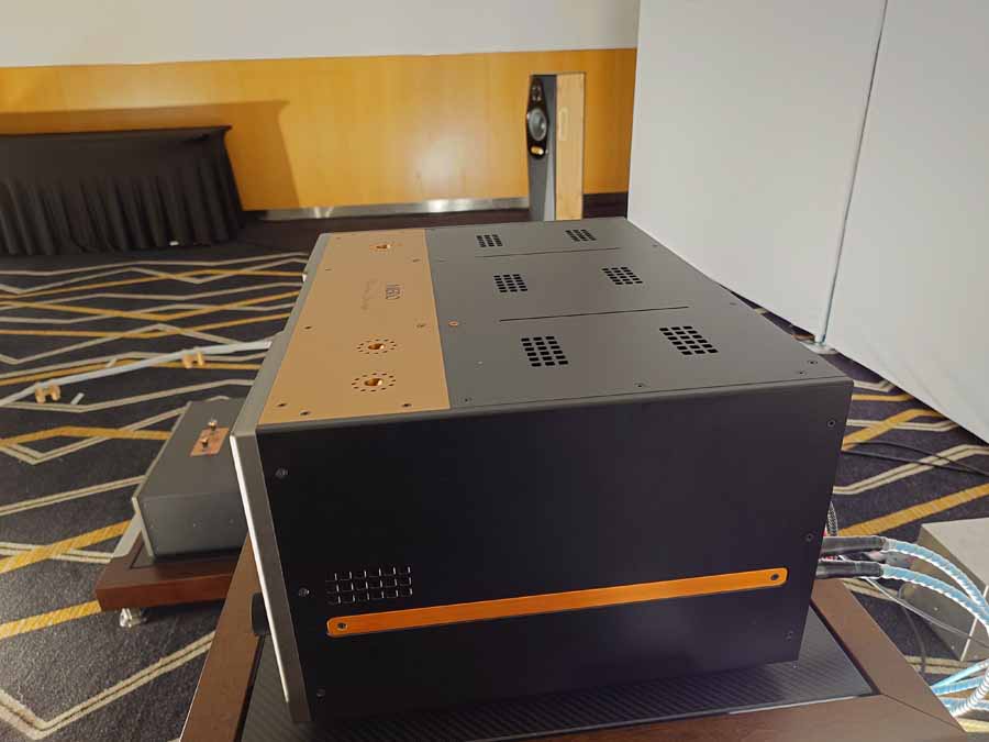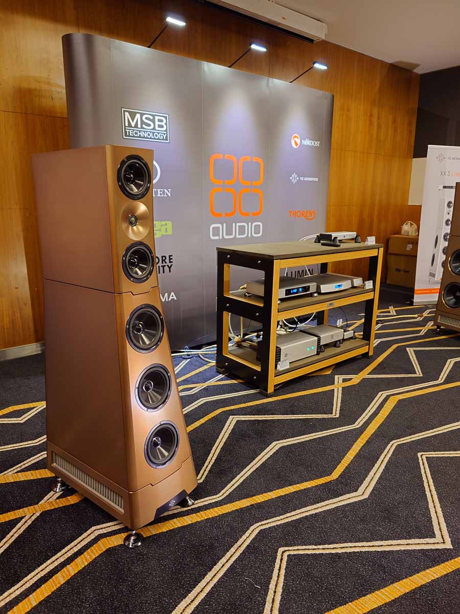 YG Acoustics was represented by the XX3 Live in a stunning custom bronze finish—a customer’s personal system that Bobby graciously brought along for the show. The timing was perfect: when I walked in, Copland’s “Fanfare for the Common Man” was blasting through a setup that couldn’t be further removed from the common man if it tried. The irony was delicious—this 20th-anniversary flagship system with its 5.6kW of amplification per speaker and advanced DSP crossovers is about as democratic as a private yacht club.
