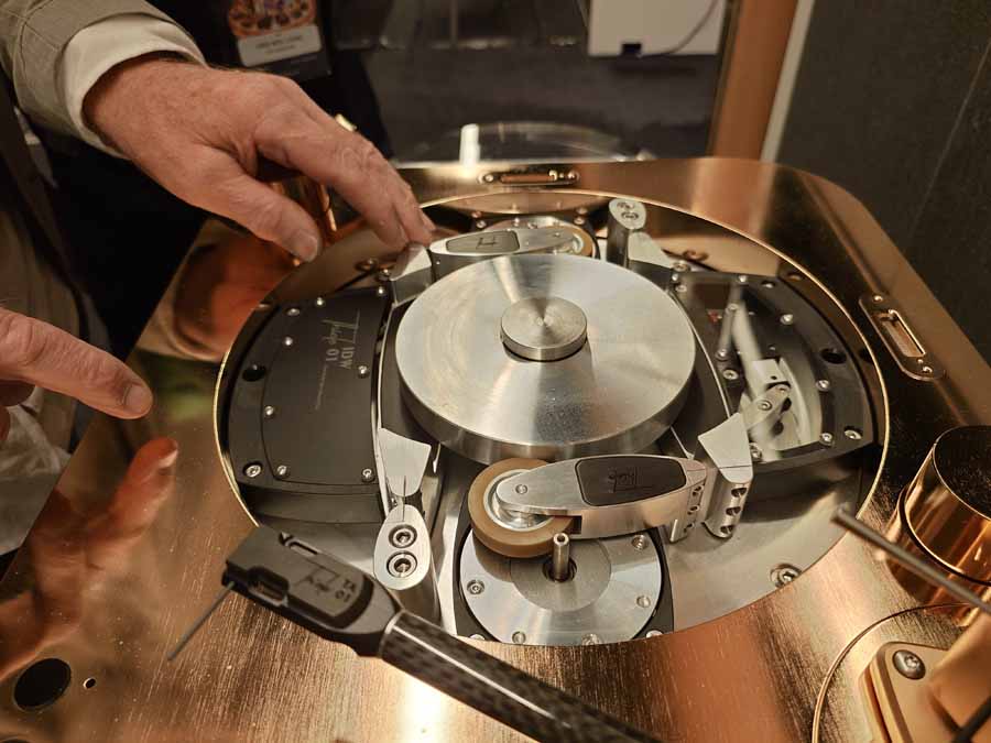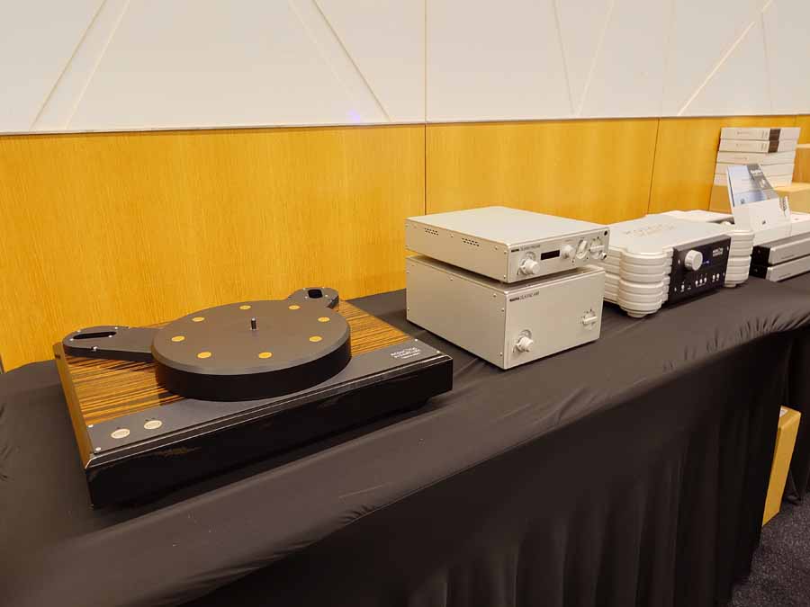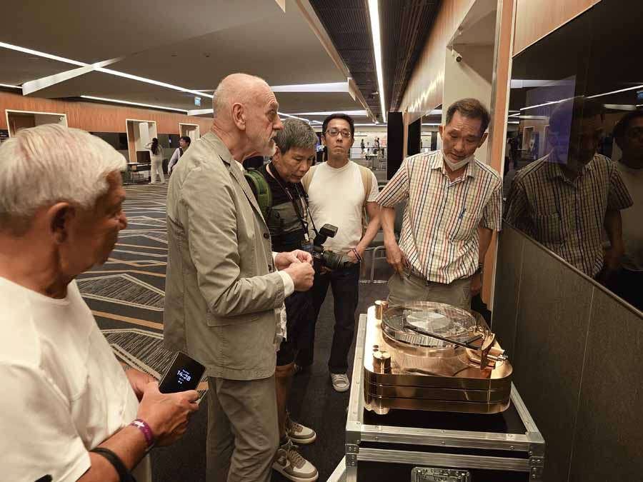 The room was filled with fascinating people and engaging conversations. Right at the entrance—on display for everyone to view and even touch—sat an engineering prototype of the upcoming Westend Ludwig turntable, presented by legendary turntable designer Helmut Thiele. The Ludwig will incorporate Thiele’s IDW 01 dual-motor idler wheel drive and his TA01 tangential tonearm—both Thiele innovations now finding a home in Westend’s upcoming flagship. The prototype looked impressive, and hearing Thiele explain his design philosophy firsthand was genuinely valuable.