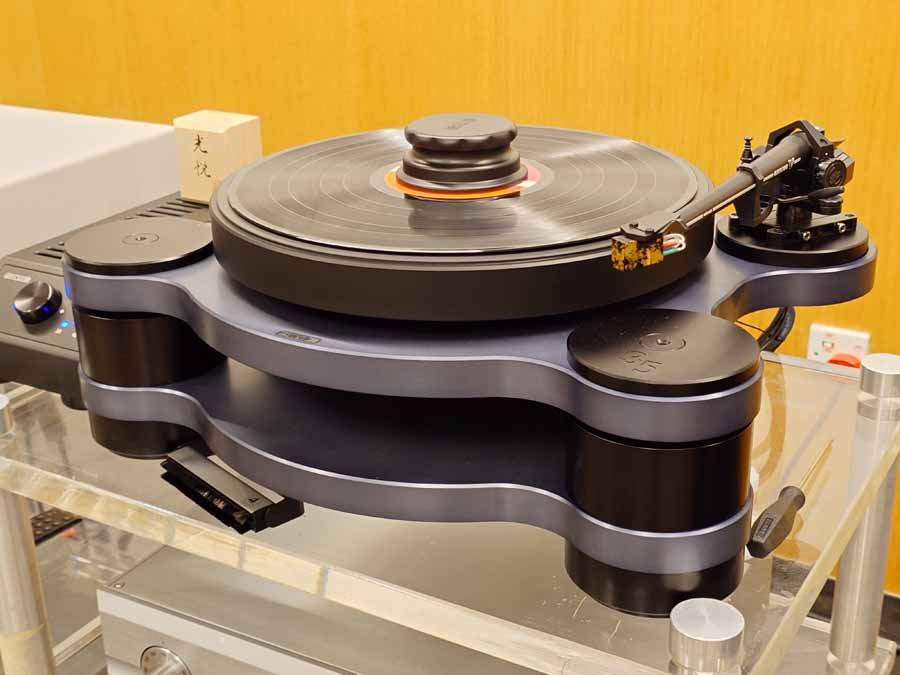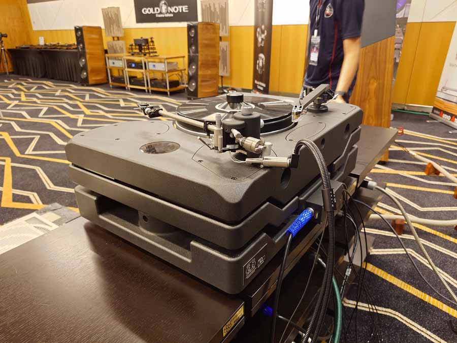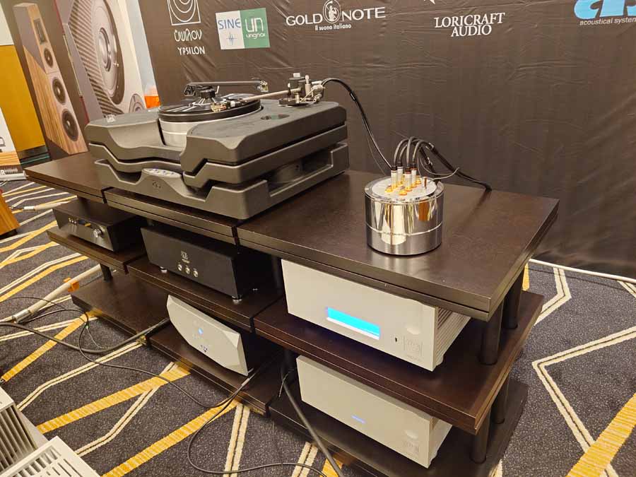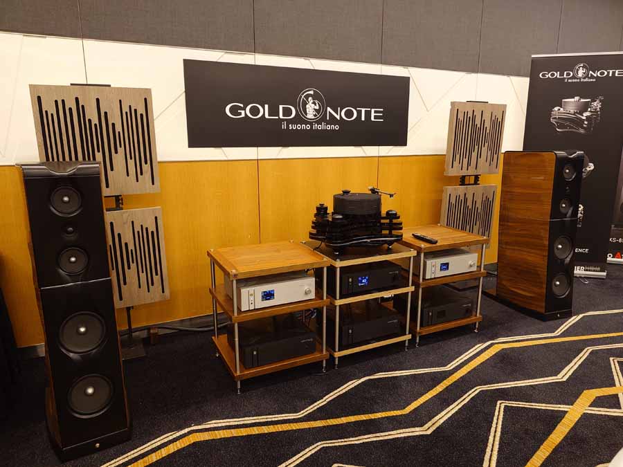The first set belonged entirely to the Florentine powerhouse Gold Note, which proves Italians don’t just excel at sports cars and espresso. The system was top-to-bottom Italian: XS-85 floorstanding speakers with their sculpted walnut cabinets, and the centerpiece Bellagio Reference turntable—fitted with a Tuscany cartridge—sat like an exhibition piece at a modern gallery. Driving this elegance, the PA-1175 MkII power amplifier and P-1000 MkII preamplifier handled the muscle, while the PH-1000 phonostage, DS-1000 EVO streamer/DAC, and PSU 1250 filled out the chain. The result? Refined, dynamic, and effortlessly musical—true sprezzatura in sonic form.