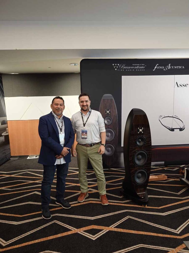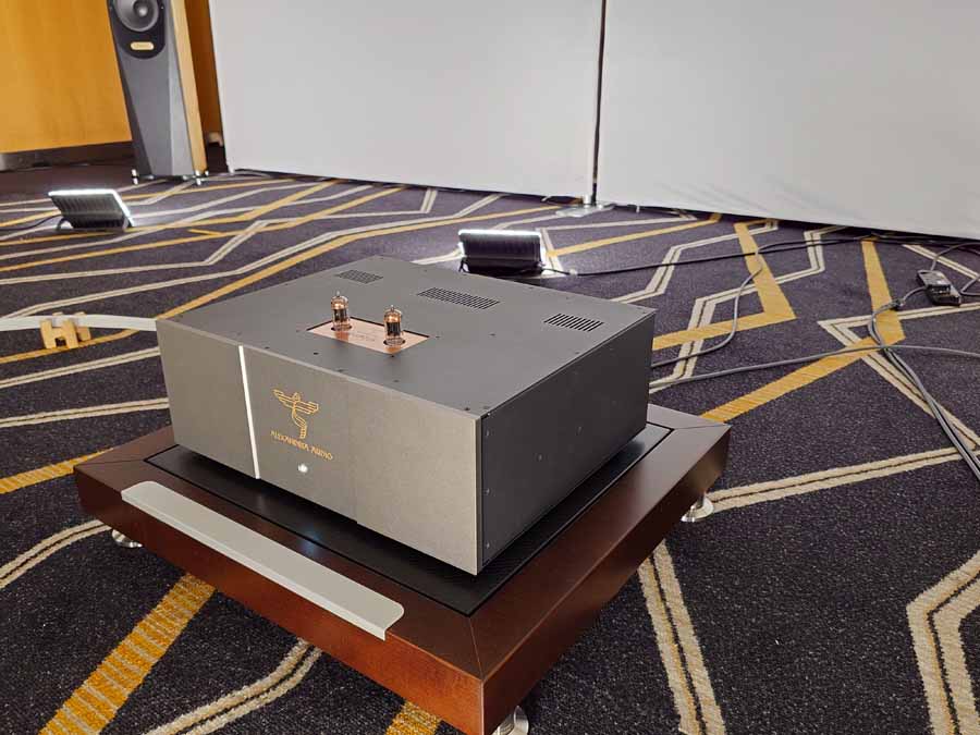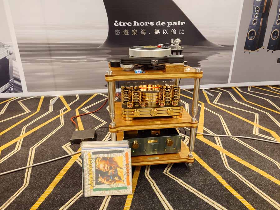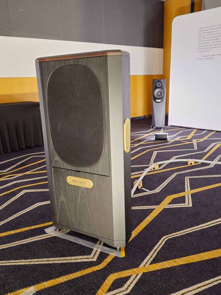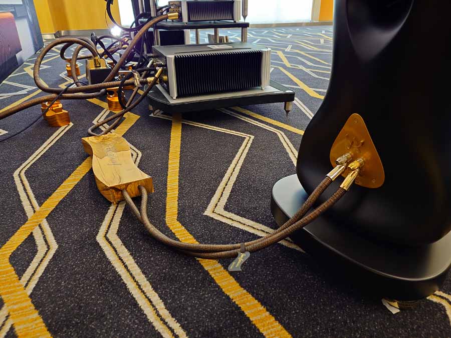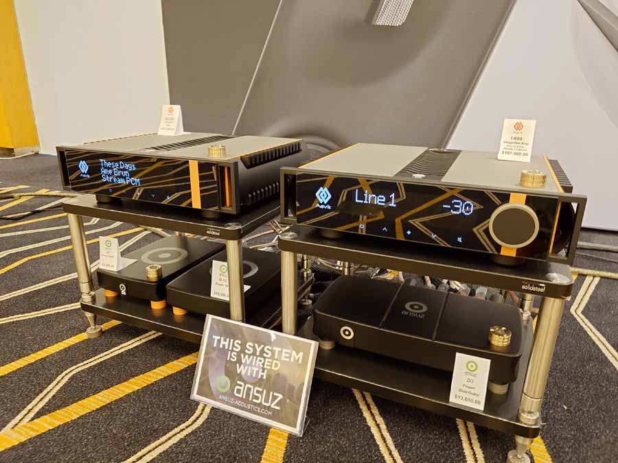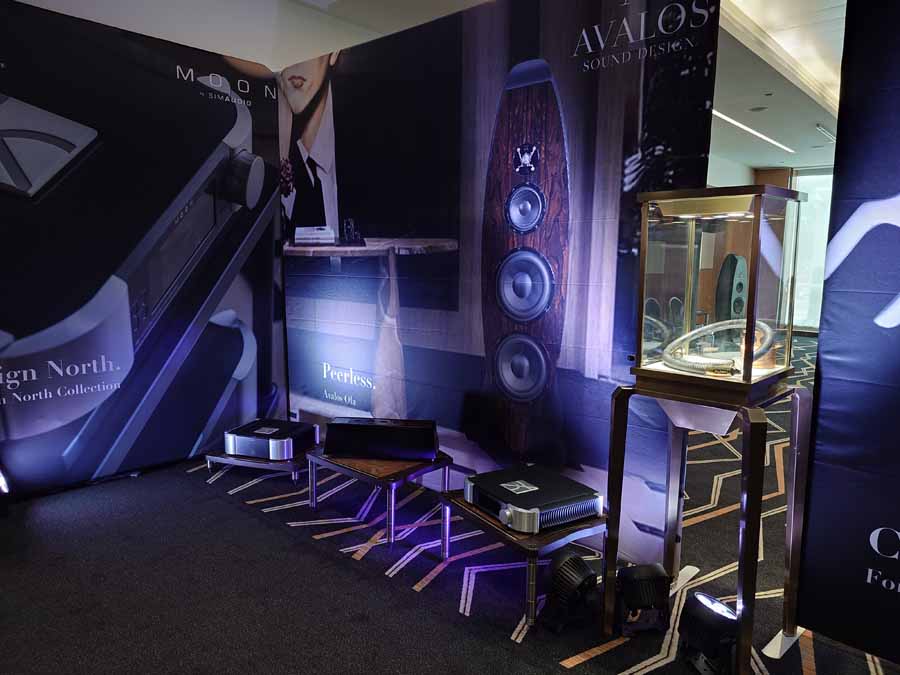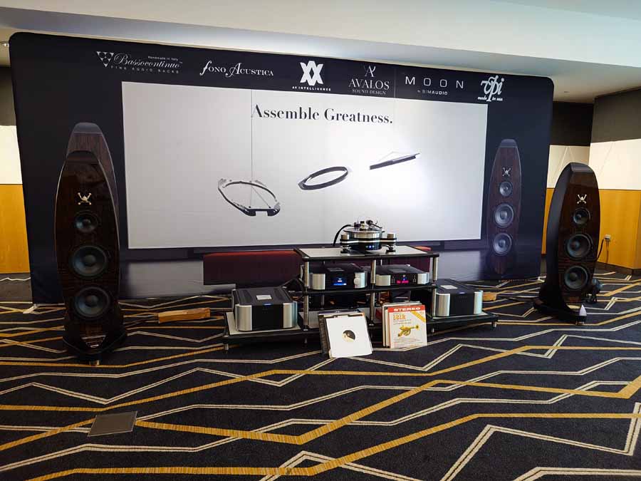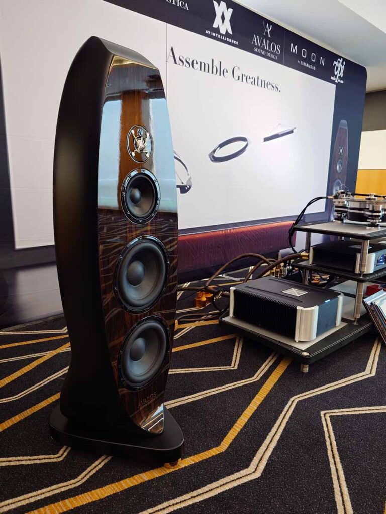 AV Intelligence created a showcase for the talented Felix Avalos, best known for his Fono Acustica cables but equally accomplished as a speaker designer. His Wave Series floorstanding speaker was the star—beautifully crafted with a magnesium-ceramic composite tweeter (quite a rare choice) and a cabinet constructed from thermoformed acrylic polymers and Panzerholz wood. At 92 dB sensitivity, these speakers are easy to drive, though during the show the Moon Audio 861 power amplifiers in mono configuration with the 891 preamp provided far more power than necessary—overkill in the best possible way. The VPI Avenger direct-drive turntable handled analogue playback duties fitted with a VPI Gold cartridge.