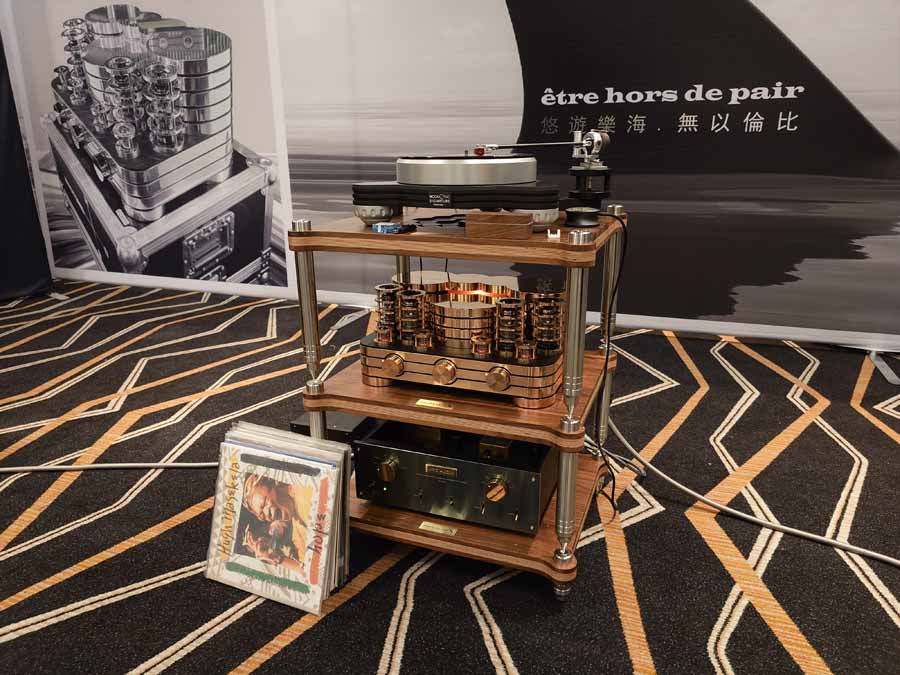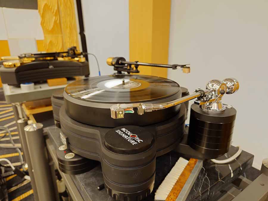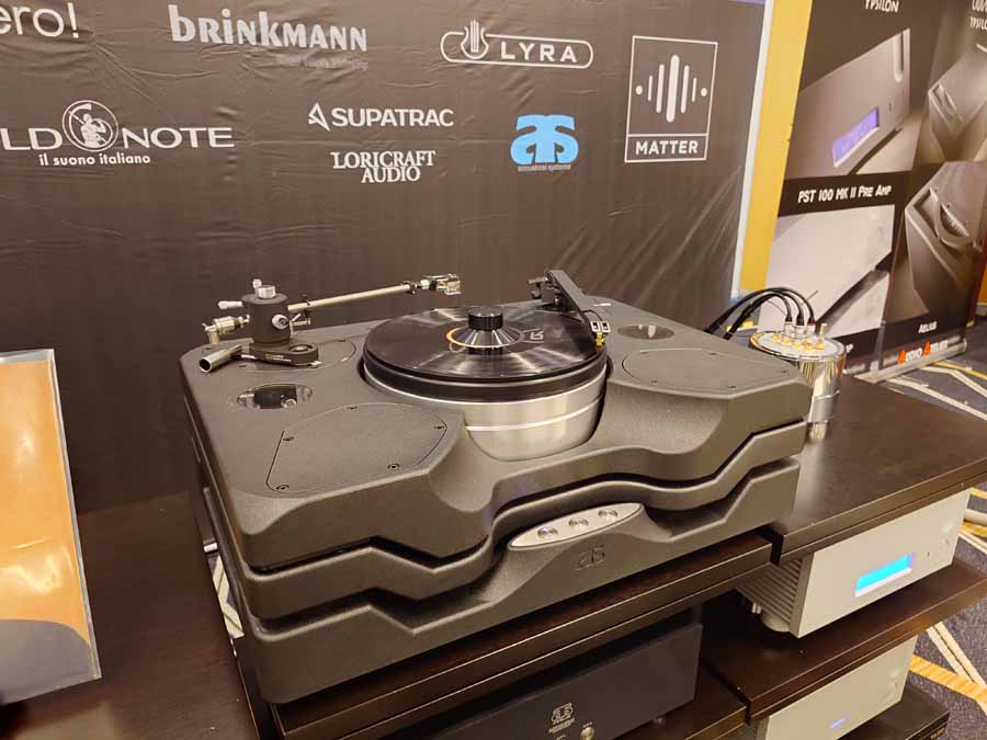 Following the Italian beauties, a 106 kg statement piece commanded the center stage: the Acoustical Systems A*STELLAR turntable sporting dual tonearms—an Axiom with Lyra Kleos and a Supatrac Blackbird carrying the Etna cartridge. Watching this German engineering marvel balanced on delicate-looking stands, it appears to defy gravity. Beneath it sat Greek muscle: Ypsilon Audio’s Hyperion monoblocks, the PST-100 preamp, and the VPS-100 phono stage, all feeding Kaiser Kawero Minal speakers. The result was a system built on the philosophy that more is, in fact, more—and the combination of German precision with Greek tube artistry proved that European collaboration works considerably better in audio than in foreign policy.