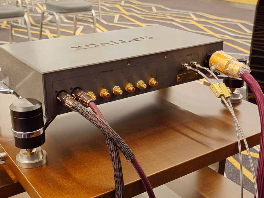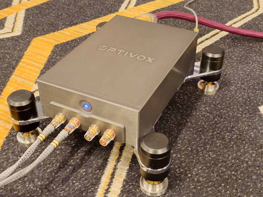 Optivox brought an unconventional idea to the show: fiber optics for high-end audio. As a major provider of fiber optic solutions, they’re experimenting with what fiber connectivity could deliver to audiophiles—eliminating electromagnetic interference and ground loop contamination in the signal path between components. Their first product is a matched preamplifier and power amplifier pair connected via fiber optic cable.