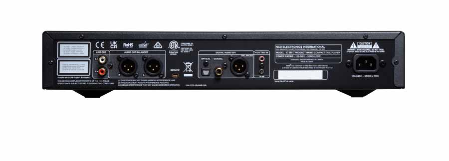 Connectivity options on the NAD C 589 CD Player include both analogue and digital outputs. Balanced XLR and RCA analogue outputs allow direct connection to amplifiers or preamplifiers. Digital outputs include AES/EBU, coaxial, and optical connections, enabling use as a CD transport with an external DAC if required.
