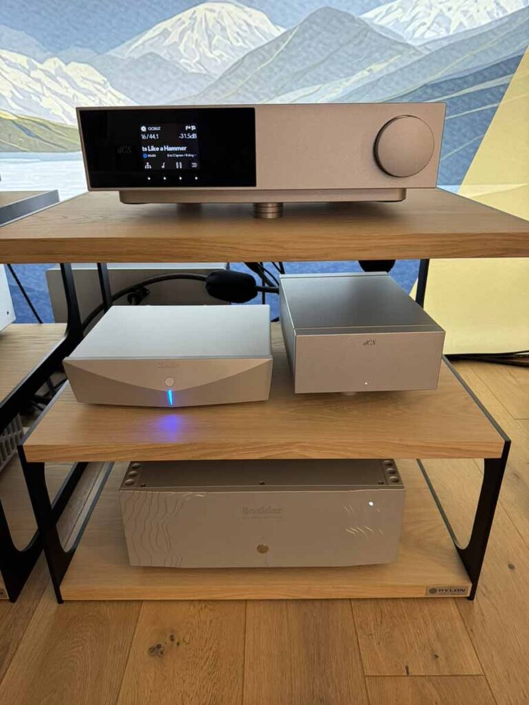 This whole ensemble had an extremely crisp and clear sound. I got a fascinating demonstration of the DCS Master Clock, which makes quite a difference to the overall sense of clarity. Alastair from DCS was demoing the kit, and the demo is a super simple one where the Clock is simply switched off, and you get a very noticeable decay in the sense of space and detail over the 15-20 seconds as the timing shifts away from where it should be. You then get the flip side of everything coming back into focus when the clock is switched back on.