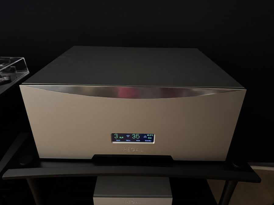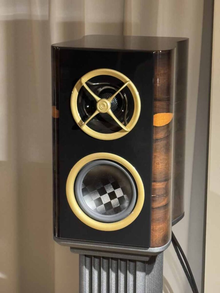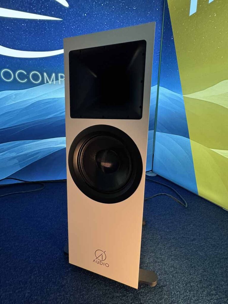 Regal Audio is the brainchild of one man: Anders Hannson. He’s responsible for the DAC 101, INT 250 amplifier, and the open-baffle/horn loudspeakers here. Supporting equipment was a Lumin streamer and a Technics turntable with a DS3 cartridge. The speakers are a 2-way design featuring a 15″ bass driver that crosses over to a horn-loaded driver at 700Hz. The baffles themselves are an interesting lamination that mixes timber layers with carbon fibre for additional stiffness. What’s also quite unusual is that the horns aren’t physically attached to the open baffle, which helps with isolation and also allows a degree of tweaking of the horn’s position relative to the bass drivers.