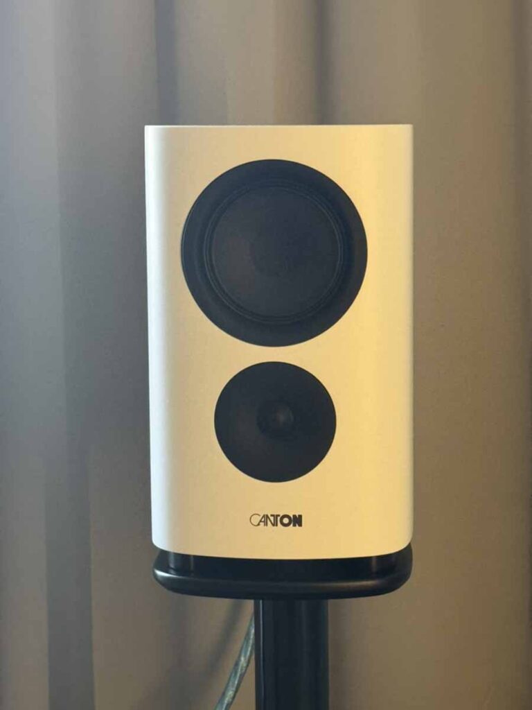 The Canton Reference 9 standmount (which we reviewed here) has a somewhat unconventional arrangement, featuring the main driver being positioned above the tweeter. Canton is a new brand for me, and these certainly make for a lovely introduction (a review of some other Canton loudspeakers is in the works – watch this space). The matt white finish on them looks stunning and contrasts really well with the matt black of the drive units. Electronics here were the Elector pre and Voltaire power amps from SPL, and a Fiio S15 streamer.