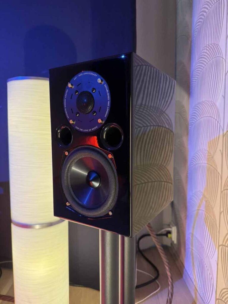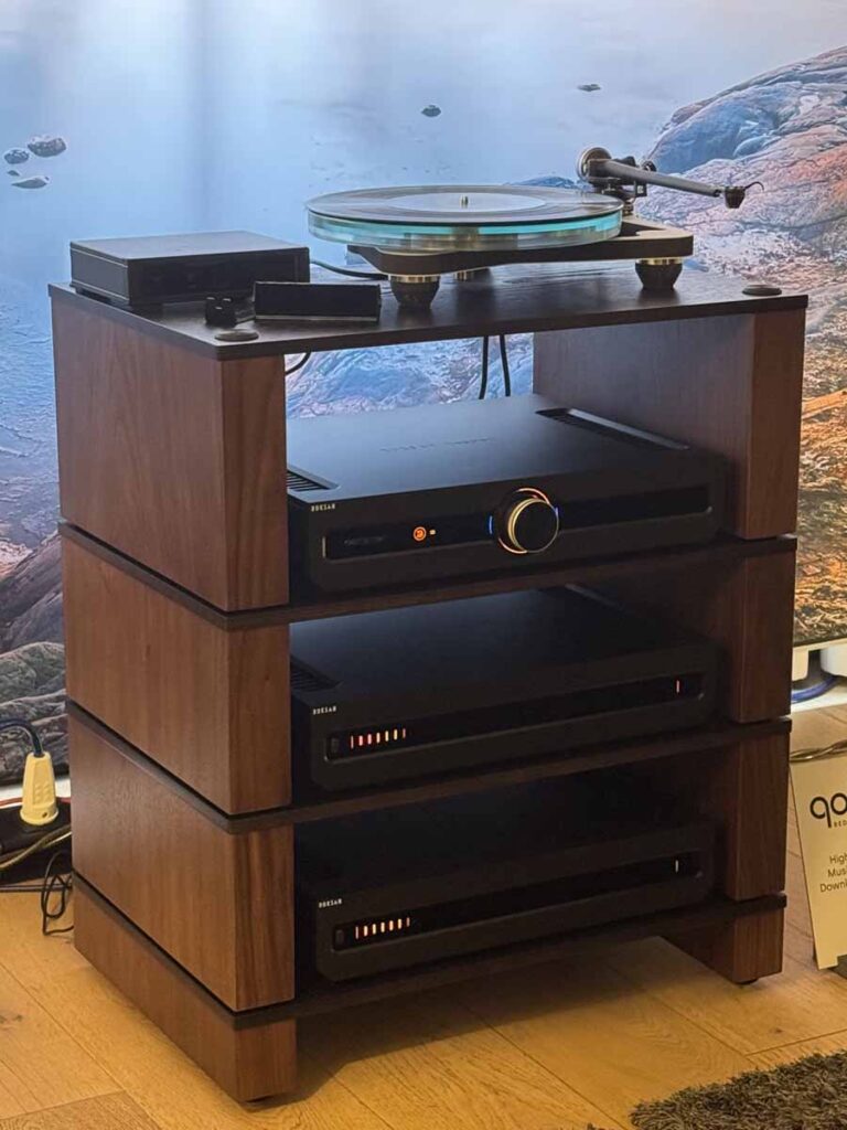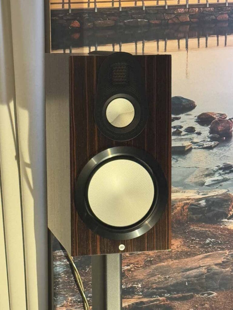 This room featured a mix of Roksan and Monitor Audio equipment, plus a Rega P8 with an ND7 cart. We had the full array of the new Caspian set, with the streamer/DAC/pre and then a pair of monoblocks. Finally, the Monitor Audio Gold 100 standmounts, alongside the Anthra 12″ subs. The standmounts are the sixth generation of the Gold, and are a 3-way construction.