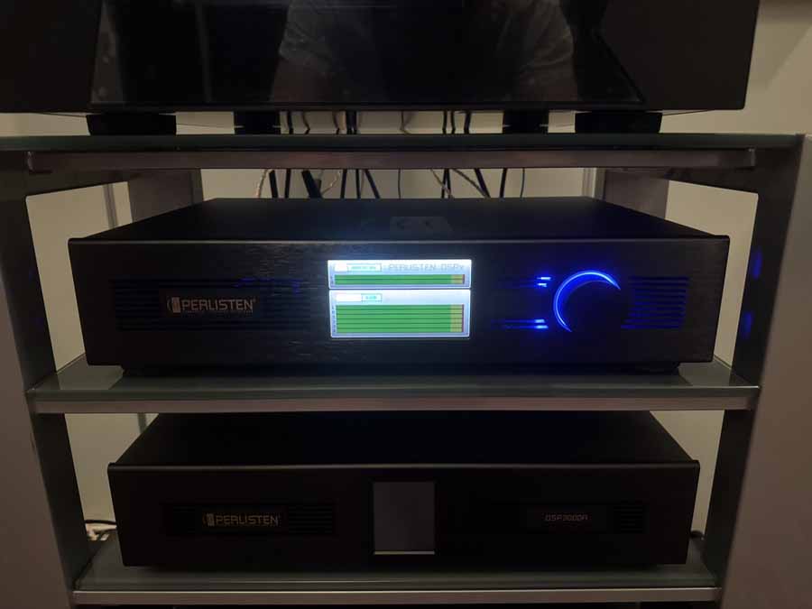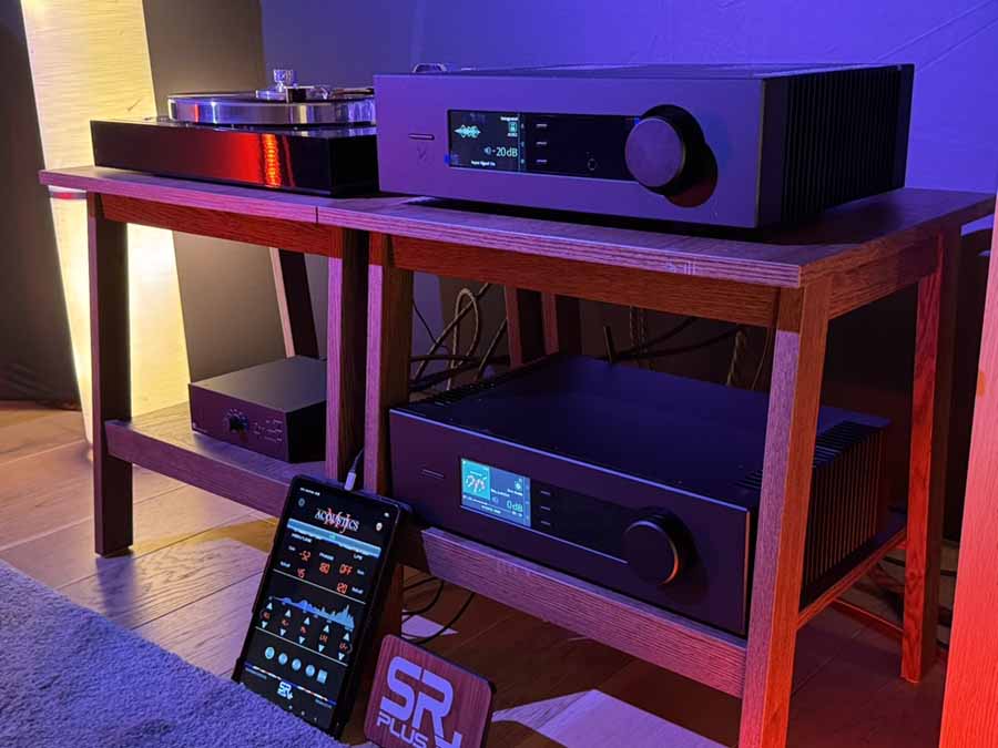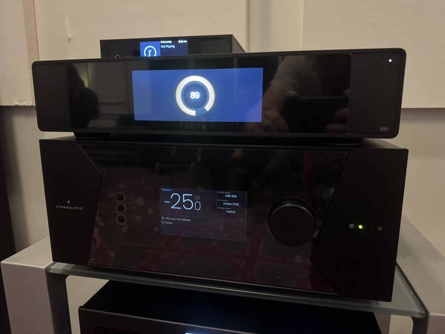 The actual loudspeakers in use were the Perlisten S7t Black Edition, alongside a pair of the D8 “low profile” subs. The D8 features a full 8×8″ drivers per side, configured in a push-pull force-cancelling configuration. Partnering all this was the Arcam SD25 streamer, which fed the Storm Audio preamp and the Bryston 28B3 (cubed) monoblocks.