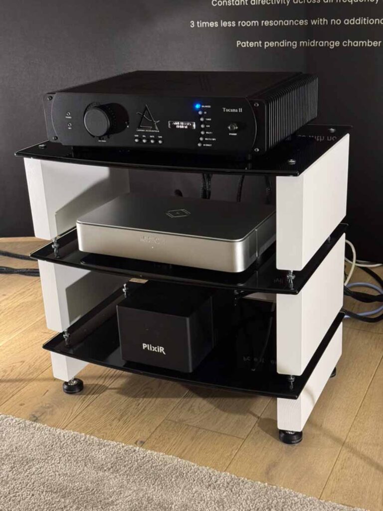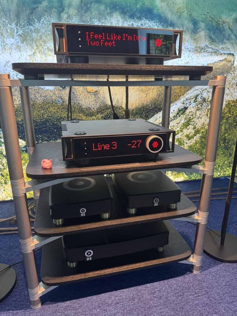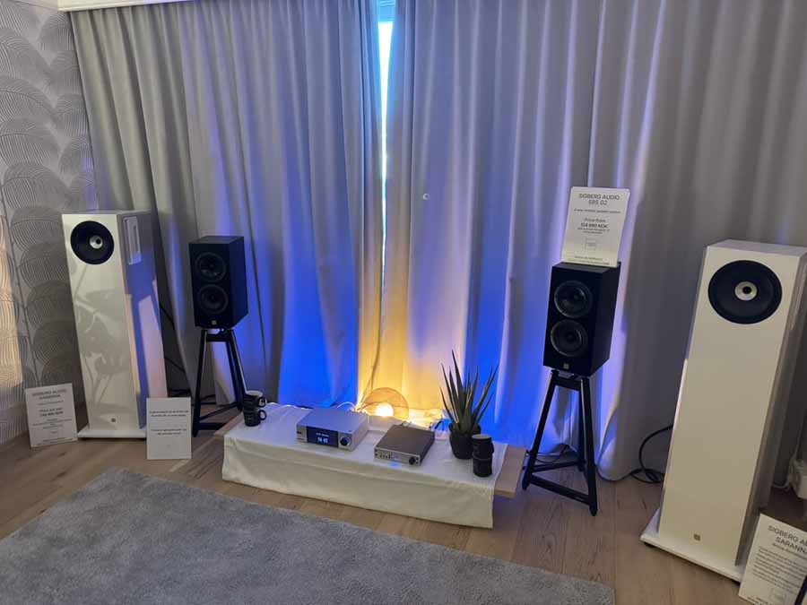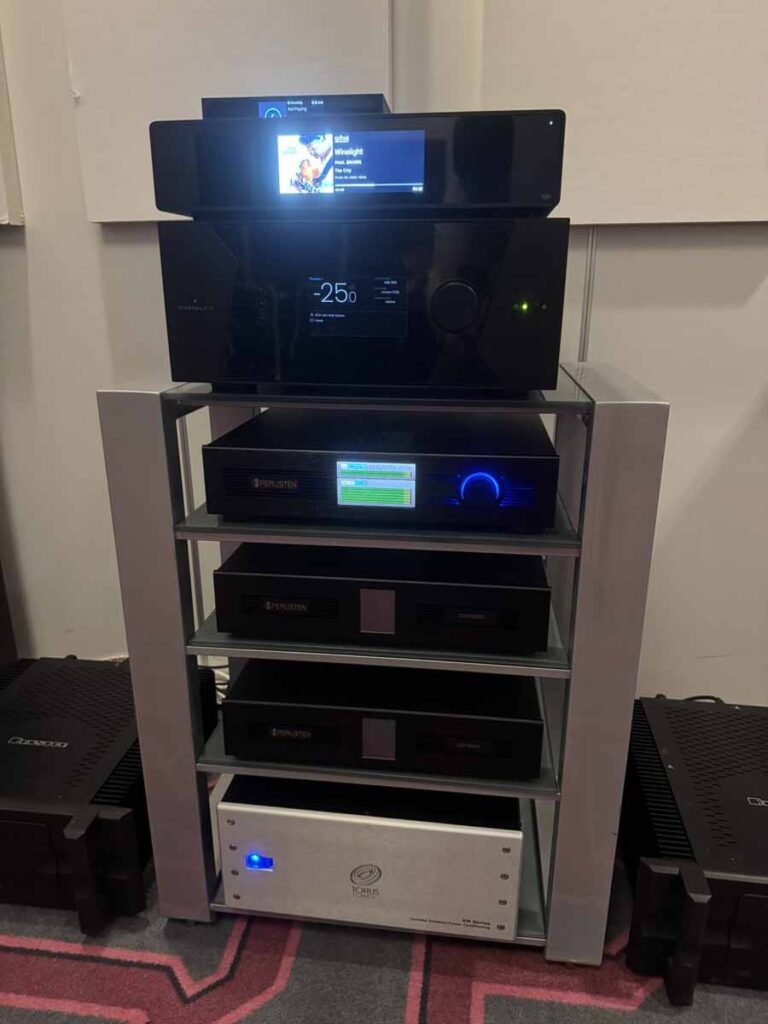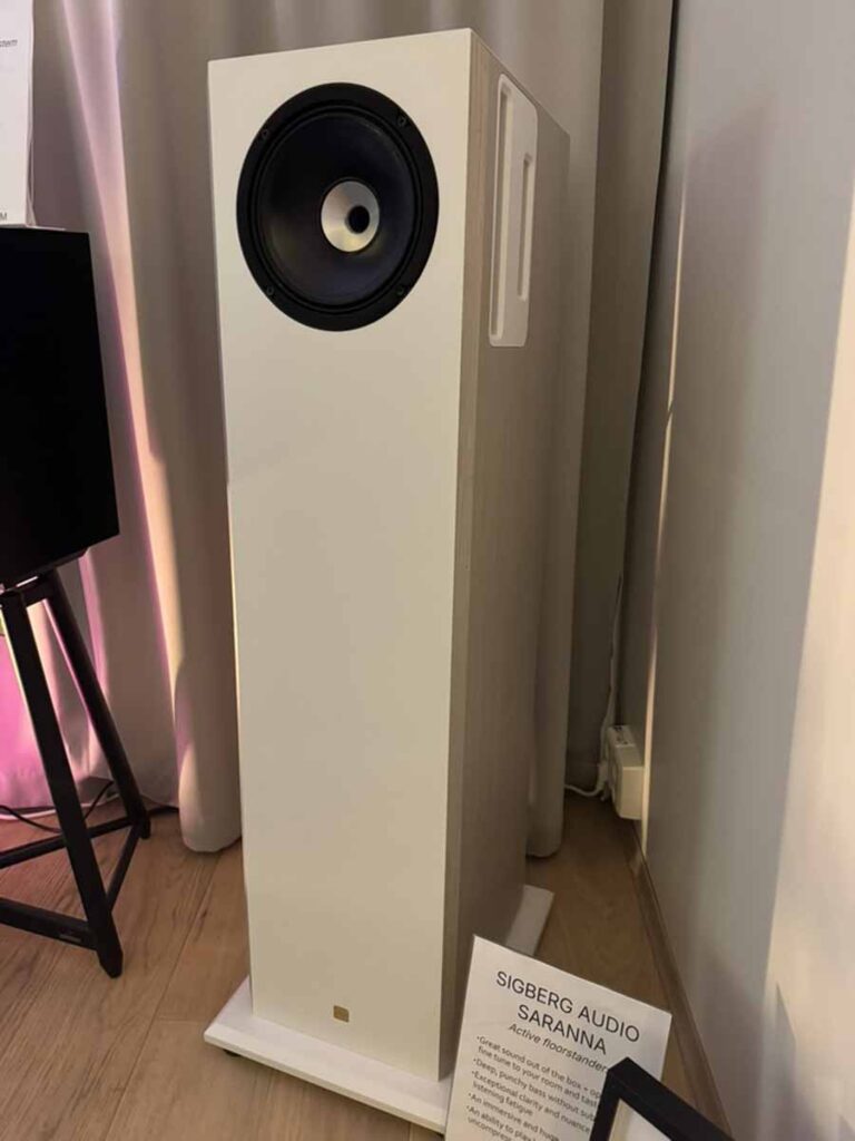 Sigberg is a completely new outfit for me, and they had two brand new products at the show. Playing were the larger Saranna floorstanders, which are active speakers, and feature a dual-concentric driver on the front, with further bass reinforcement coming from two additional 8″ drivers mounted on the rear. An Eversolo DMP-A6 was used as a streamer, and a Benchmark DAC3L was covering both conversion and pre-amp duties.