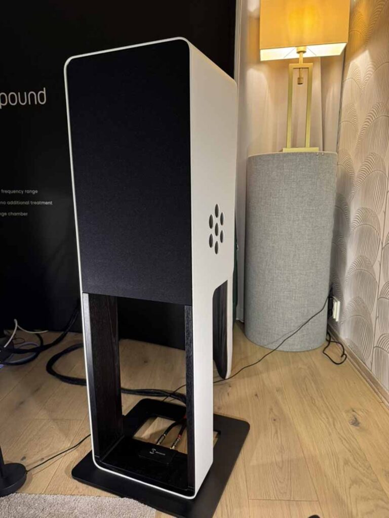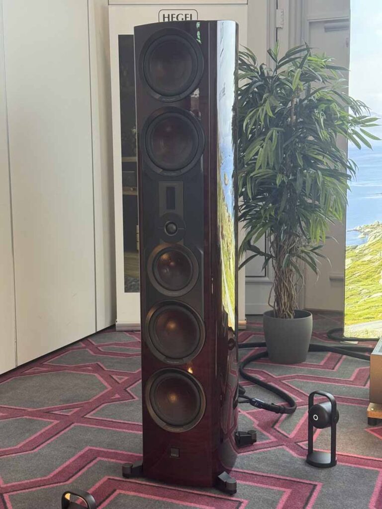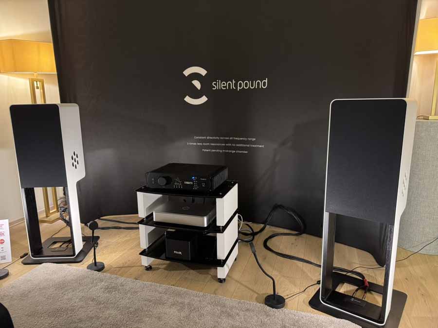 Despite Stu having reviewed all the available Silent Pound loudspeakers, this was my first time hearing any of their handiwork, and I’m pleased to report they do extremely good work indeed! This was the Bloom loudspeaker’s first outing at a Norwegian show, and it’s quite a different beast from the Challenger that first launched the company. Per se, this is a standmount loudspeaker, but all the stand elements are fully integrated into the body. So it’s a complete unit as is, and you don’t need to find a set of stands for them. This also gives the slightly odd visual of the cables running into the stand at roughly floor level, rather than into the rear of the main body.