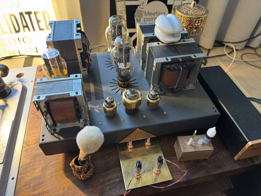 Lasse Gretland is a character who is well known to us at HiFi PiG Towers, and he’s an absolute character in general. He’s completely responsible for the Little Fwend tonearm lifter, but also the Norwegian importer of step-up transformers from Consolidated Audio in Berlin. The room here was very atypical for a HiFi show, utilising assorted vintage equipment, including a kit-based valve power amp, and various fun knick-knacks, such as a model owl that served as a holder for his vinyl brush. The speakers were from DeVore Fidelity and were natural bedfellows for the homemade valve power amp.