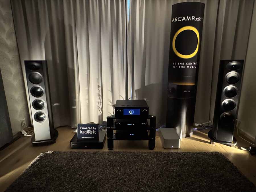 The primary demonstration here was the new Arcam R45 floorstander, which features ceramic drivers throughout. This was matched by the SA45 streaming amplifier, which was using Dirac Live for room correction.