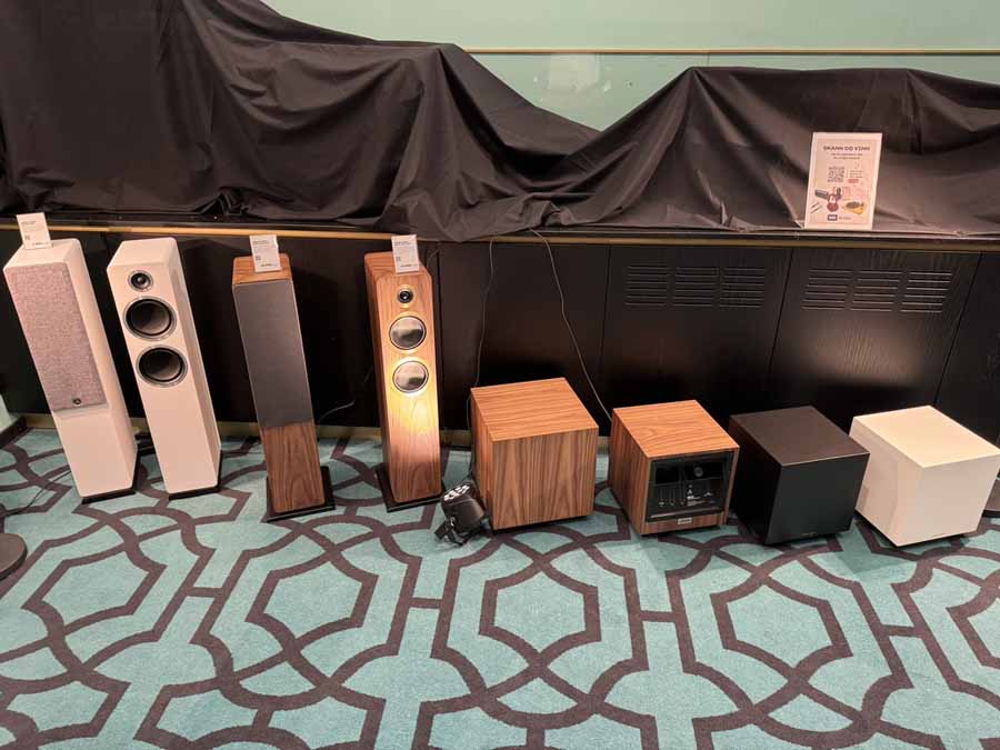 There’s something rather charming about the approach taken with this room, which I think beautifully complements the price point these products sit at. Two Wiim Sound speakers (£299 per pair) sat on a simple table, and a Sub Pro (£429) tucked away in a corner. This felt very redolent of a British lounge or living room, where products might be set on a sideboard or dresser rather than on dedicated stands or racks. They were happily demonstrating with the sub both on and off, and understandably, given the pint-pot size of the speakers, it makes a significant contribution to the overall sound.