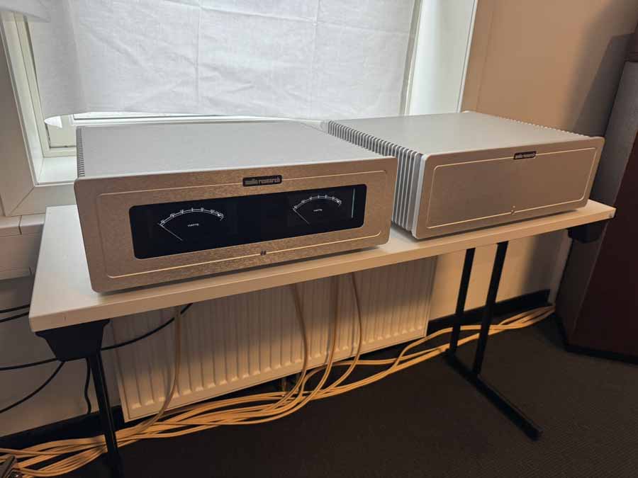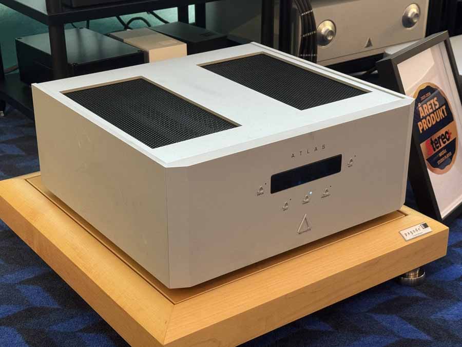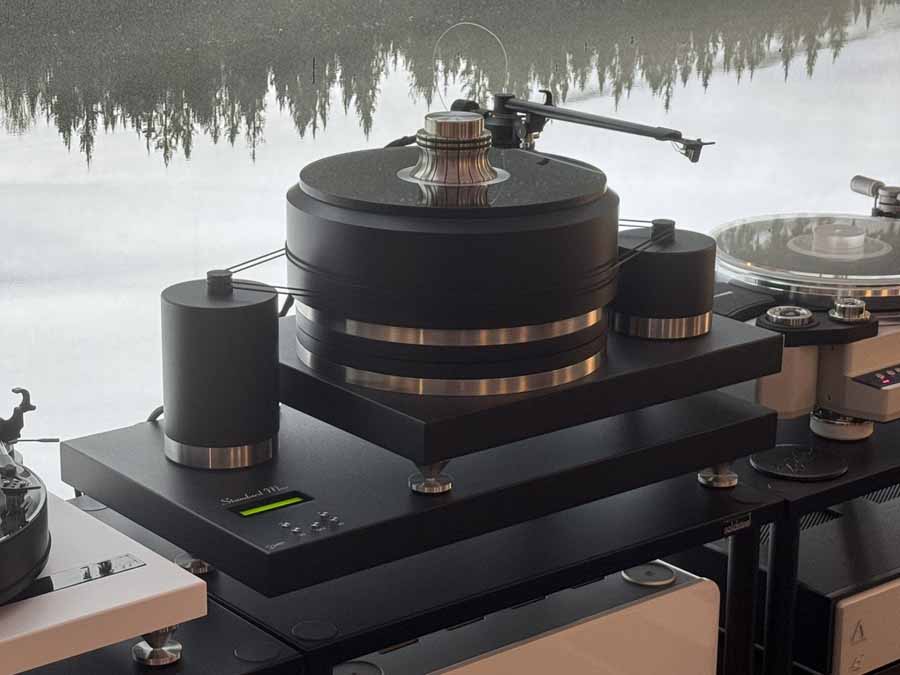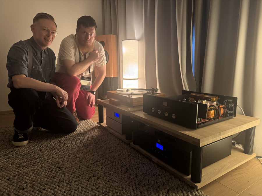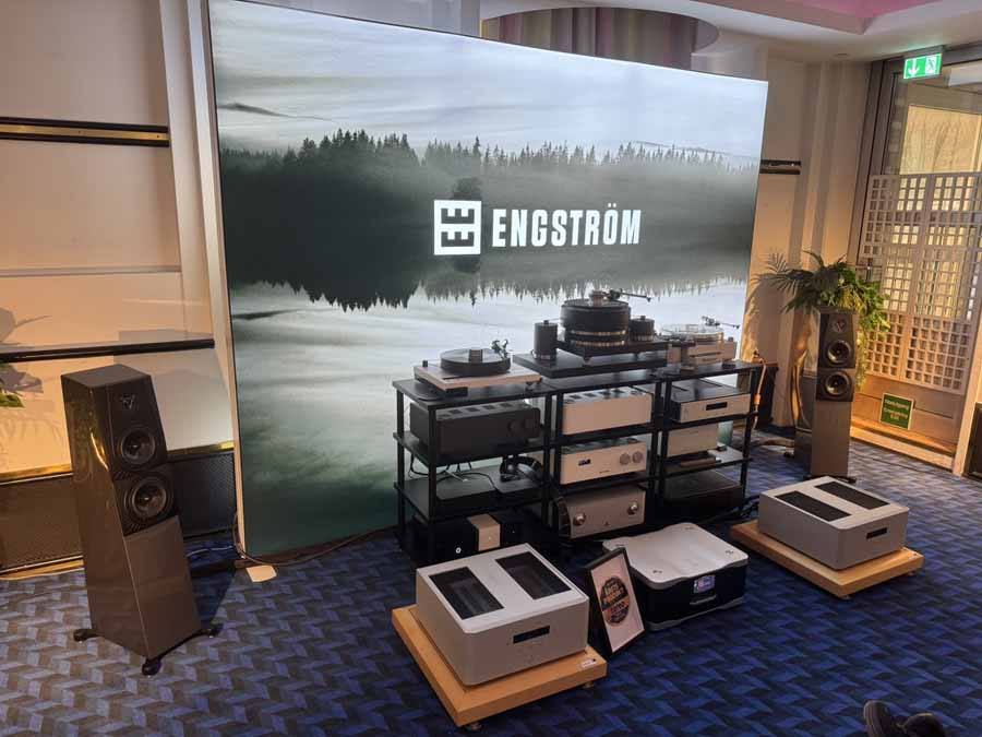 Inside was on a different scale. Front and centre was an absolute tank of a turntable, the Sikora Standard Max. Alongside, there was another chunky unit, the Wadax Studio Player from Spain. The record player was running through the new Engstrøm M-2 phono stage, and both were then running into the Engstrøm Monica pre-amp. This pre is a 2-box affair with a dedicated chassis for the power supply. A pair of Aesthetix Atlas monoblocks were then driving the Storgaard & Vestskov Gro floorstander.