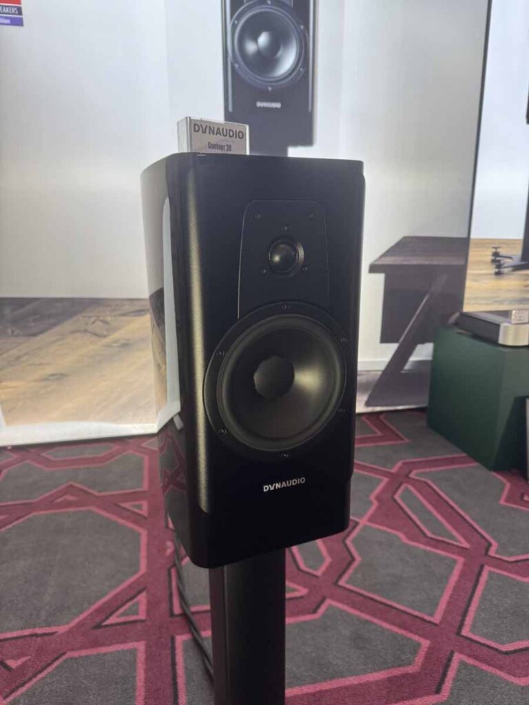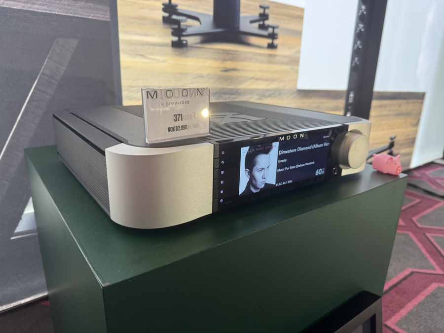 One of the largest rooms in the show (~100sqm, with a fairly high ceiling), demonstrating one of the more compact systems. The new Moon 371 all-in-one, effectively the big brother to the popular Moon ACE, was driving the standmount Dynaudio Contour 20 Black Edition. This was definitely a system that really took an unconventional approach, but that absolutely confounded the expectations one would naturally have. These 2-way standmounts absolutely filled the space, apparently without any kind of struggle. Certainly, nothing sounded forced at all. The laws of physics do kick in with regard to the last word in low-end extension, but significantly, this still all sounds completely natural; there’s no farting from the bass port attempting to artificially reproduce extra low-end oomph, or any of the other issues you can encounter when you try to get a relatively small surface area of driver to really pressurise the room.