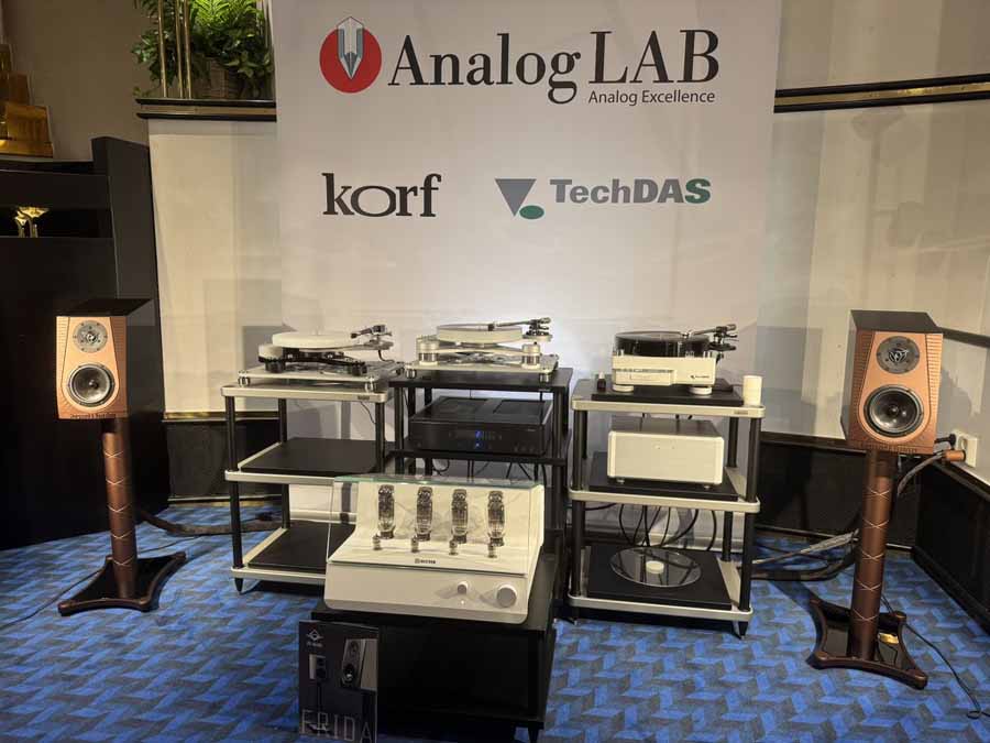 It’s quite nice to get to sit in front of such a completely analogue system. Vinyl only as a source (Dr. Feickert Woodpecker, Tri-Planar arm, Zyx 4D cartridge), and all the amplification coming via valve-based (and not hybrid) equipment. A number of brand-new products were being demonstrated here for the first time: the Air Tight ATM 1S power amp and the Usher ND 5 floorstanders, along with a not-new Ear 912 “Professional Tube Control Centre”, aka the pre-amp. The overall sound was just extraordinarily easy on the ear. I was a little apprehensive about the diamond tweeter on the Ushers, as I invariably find diamond tweeters can often sound very bright, but in tandem with the Air Tight, it produced a great level of detail without any sense of shrillness.