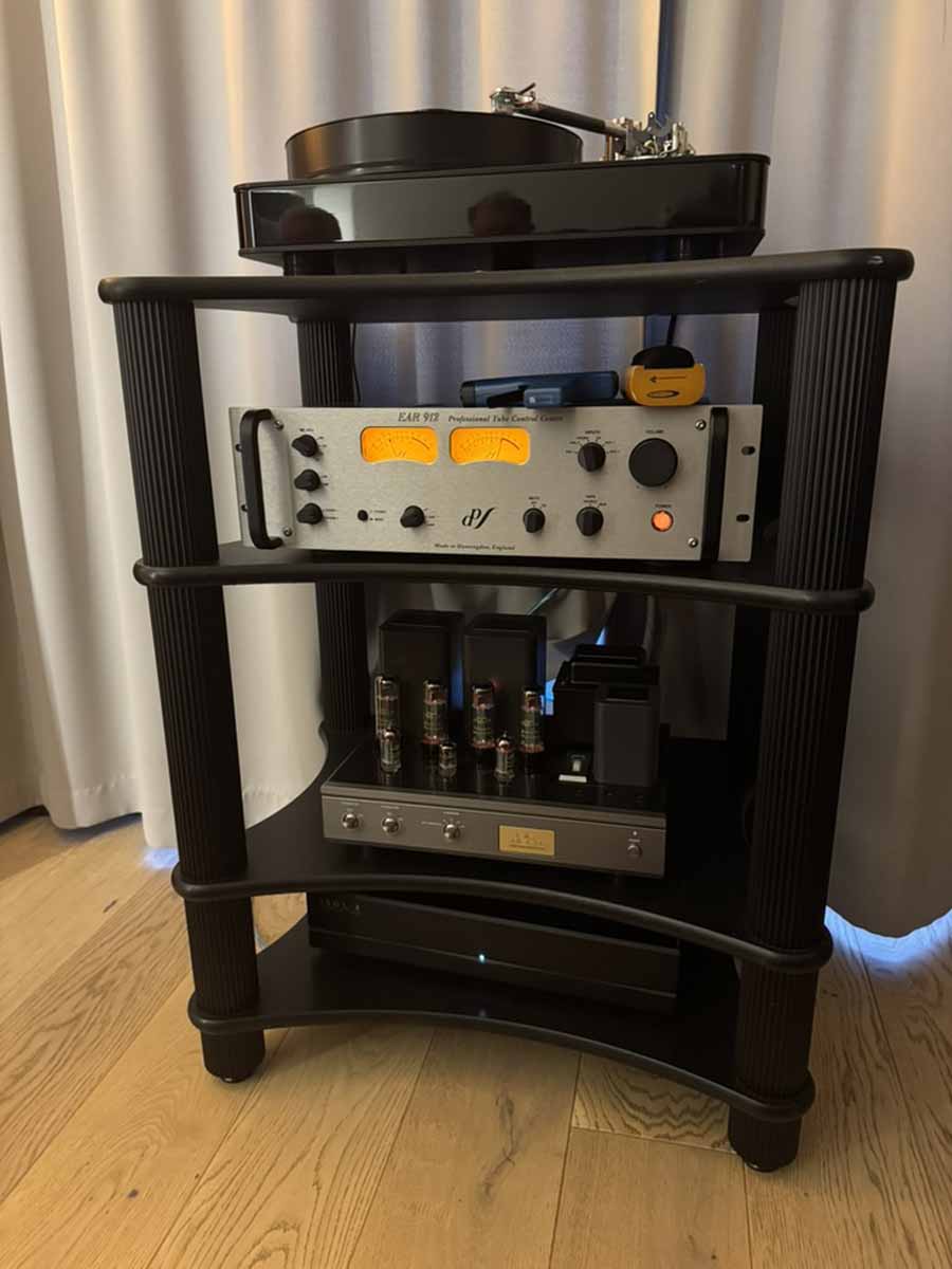 The outside system was utilising a TechDas Air Force V, Korf T9 arm, and a TechDas cartridge. This was running into an Aesthetix Rhea phono stage. We then had the absolutely stunning-looking Engtröm Arne integrated, which runs 4x300B valves. The speakers were a very distinct-looking and compact standmount from Storgaard & Vestskov, the Freda (and if the bronze look isn’t your thing, they offer a host of varied finishes). These are hugely impressive standmounts, running down to a nominal 30Hz, but with a particularly gentle roll-off, which are quite frankly mad numbers.