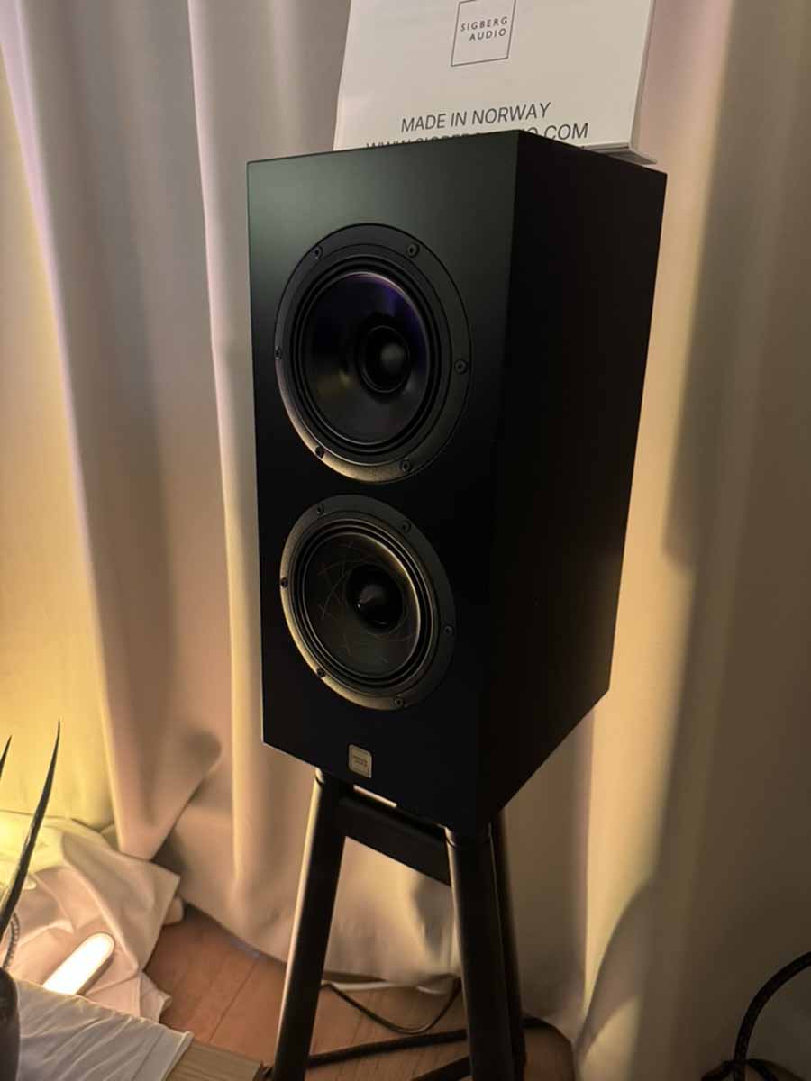Despite Stu having reviewed all the available Silent Pound loudspeakers, this was my first time hearing any of their handiwork, and I’m pleased to report they do extremely good work indeed! This was the Bloom loudspeaker’s first outing at a Norwegian show, and it’s quite a different beast from the Challenger that first launched the company. Per se, this is a standmount loudspeaker, but all the stand elements are fully integrated into the body. So it’s a complete unit as is, and you don’t need to find a set of stands for them. This also gives the slightly odd visual of the cables running into the stand at roughly floor level, rather than into the rear of the main body.