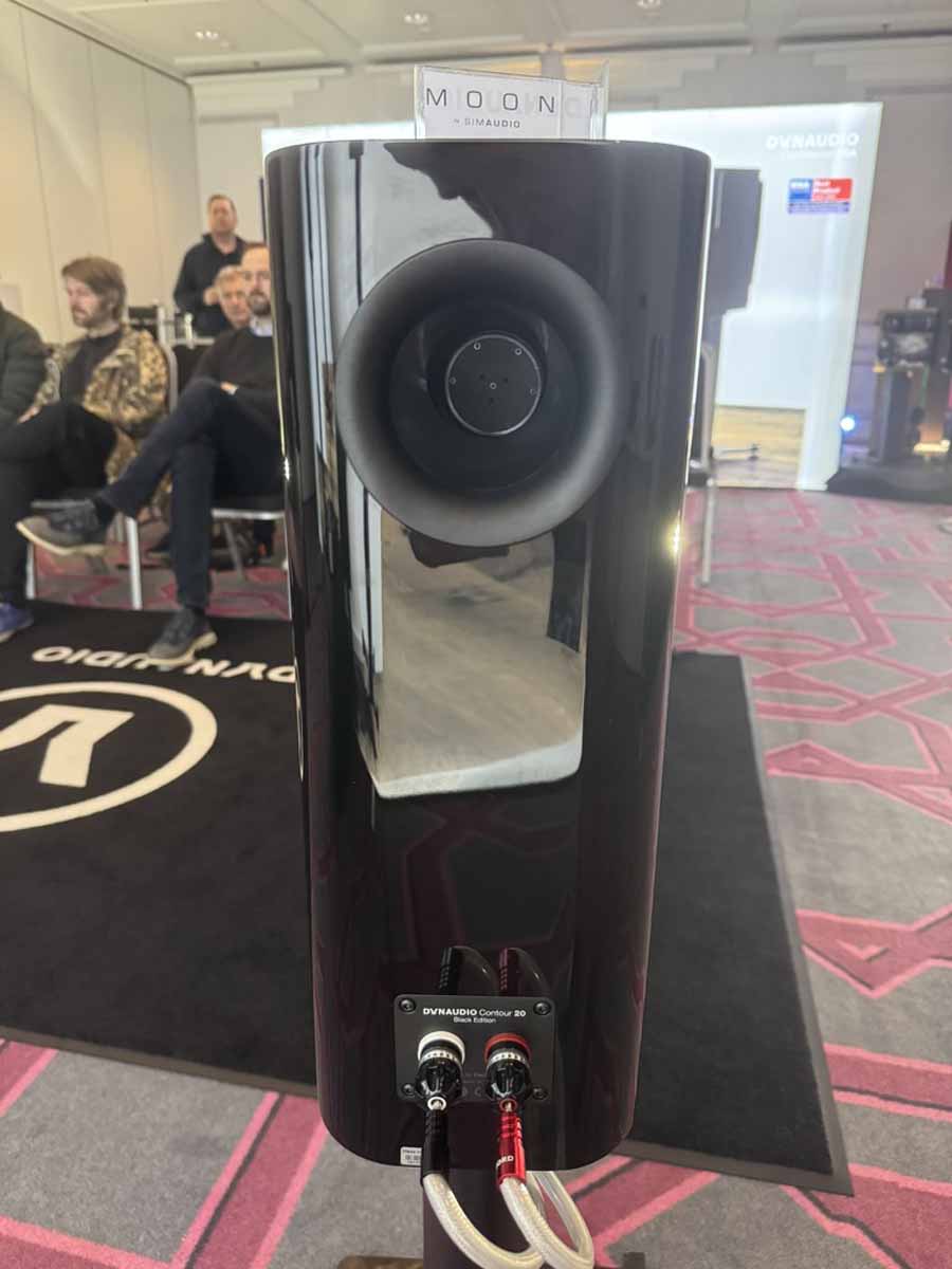 One of the largest rooms in the show (~100sqm, with a fairly high ceiling), demonstrating one of the more compact systems. The new Moon 371 all-in-one, effectively the big brother to the popular Moon ACE, was driving the standmount Dynaudio Contour 20 Black Edition. This was definitely a system that really took an unconventional approach, but that absolutely confounded the expectations one would naturally have. These 2-way standmounts absolutely filled the space, apparently without any kind of struggle. Certainly, nothing sounded forced at all. The laws of physics do kick in with regard to the last word in low-end extension, but significantly, this still all sounds completely natural; there’s no farting from the bass port attempting to artificially reproduce extra low-end oomph, or any of the other issues you can encounter when you try to get a relatively small surface area of driver to really pressurise the room.