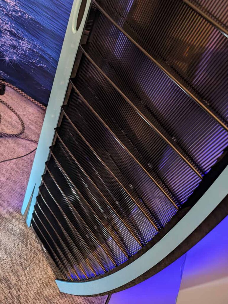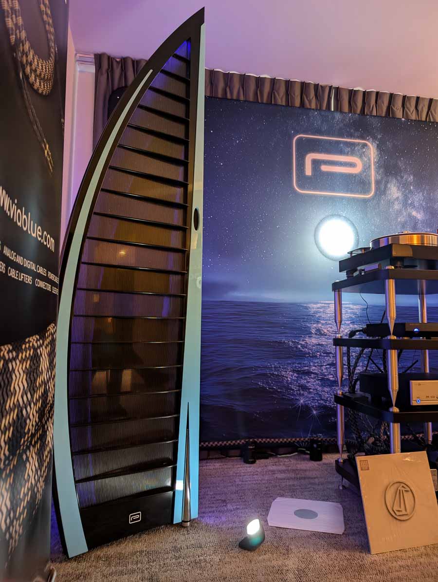 The Popori Acoustics Vitorla is hand-assembled, with each electrostatic panel individually measured. The loudspeaker features a tall, curved frame and includes integrated LED lighting intended to highlight the structure and visual presence of the speaker within the listening environment.