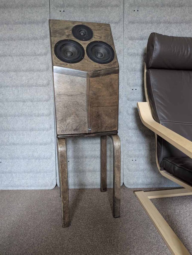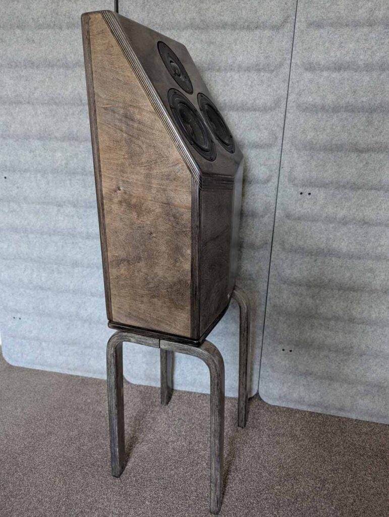 As a young adult, Richard realised that there was no conventional-sized or shaped loudspeaker at any budget that would do what he wanted them to do; hence, his speakers are certainly very unique in design and shape. All RMB speakers deploy angled baffles where the drivers are situated, looking vastly different to the conventional square-box strategy. Indeed, Richard doesn’t like sharp edges on anything, so children and cats can have no fear. 18mm birch plywood is clearly visible at all edges of the cabinet, which shows off the rigidity of the glued multi-layered wooden “plies”, creating a cabinet with very low vibration.
