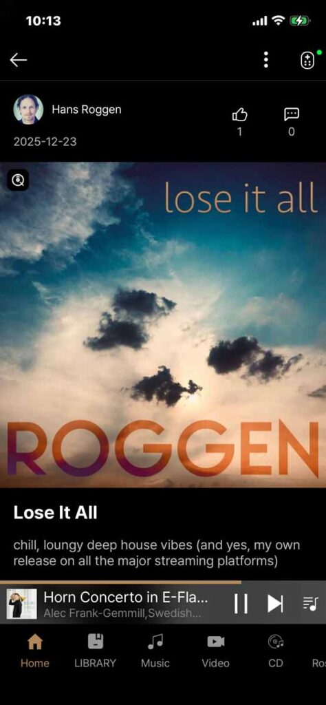 Library management has been updated with folder-based organisation and multi-select editing, allowing users to move or delete multiple tracks at once. Playback availability for network and DLNA content can be checked directly within the library. Social features have also been refined, with improved visibility of user profiles, playlists and activity feeds, alongside simplified access to personal pages.