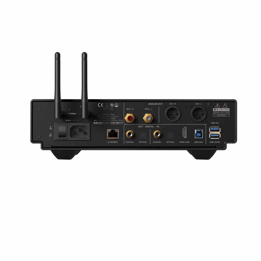 Streaming options include TIDAL Connect, Qobuz Connect, AirPlay 2 and DLNA, allowing playback from a range of mobile and networked devices. Local playback is supported through NAS drives, USB storage and an internal M.2 SSD slot. Network connectivity is handled via Gigabit Ethernet and dual-band Wi-Fi 6, while Bluetooth 5.2 with LDAC, AAC and SBC codecs enables wireless audio reception.