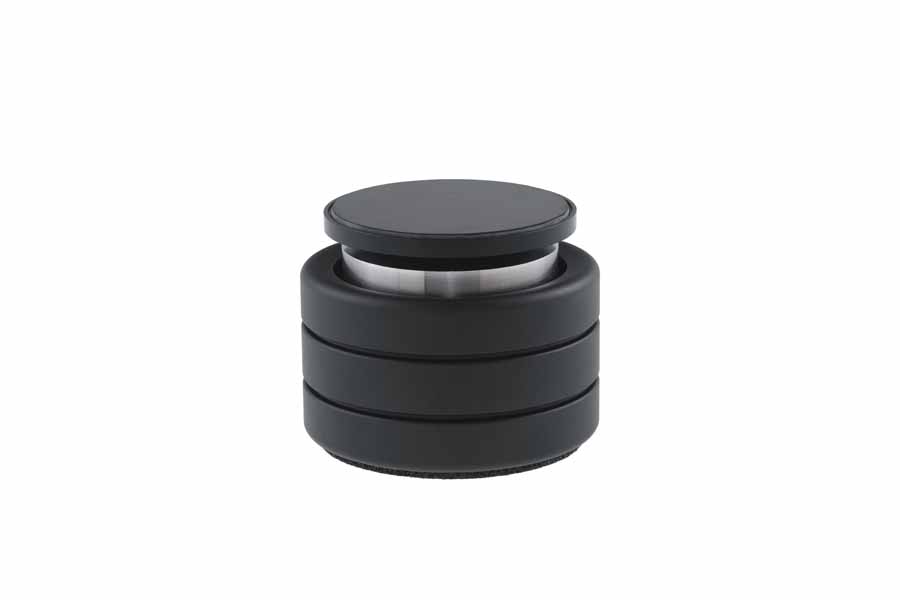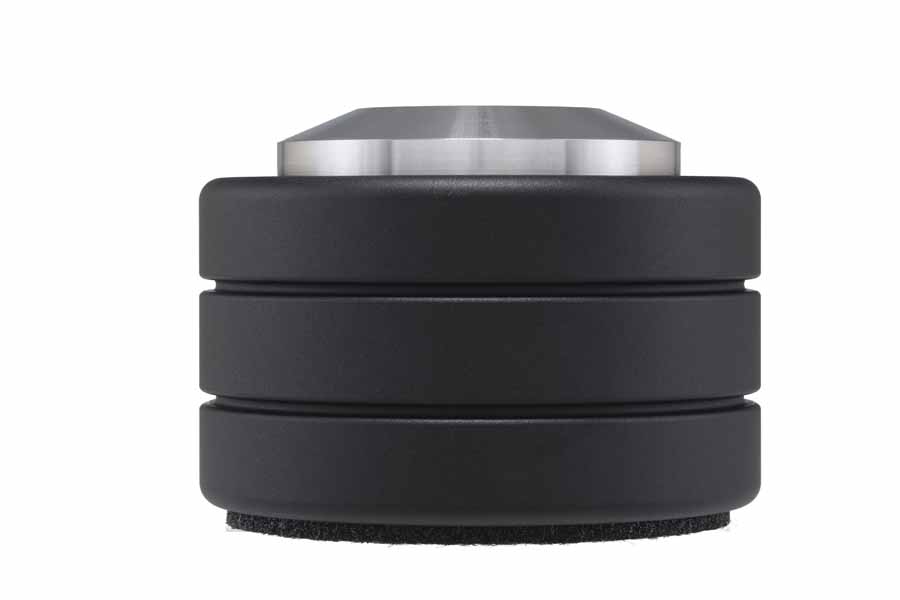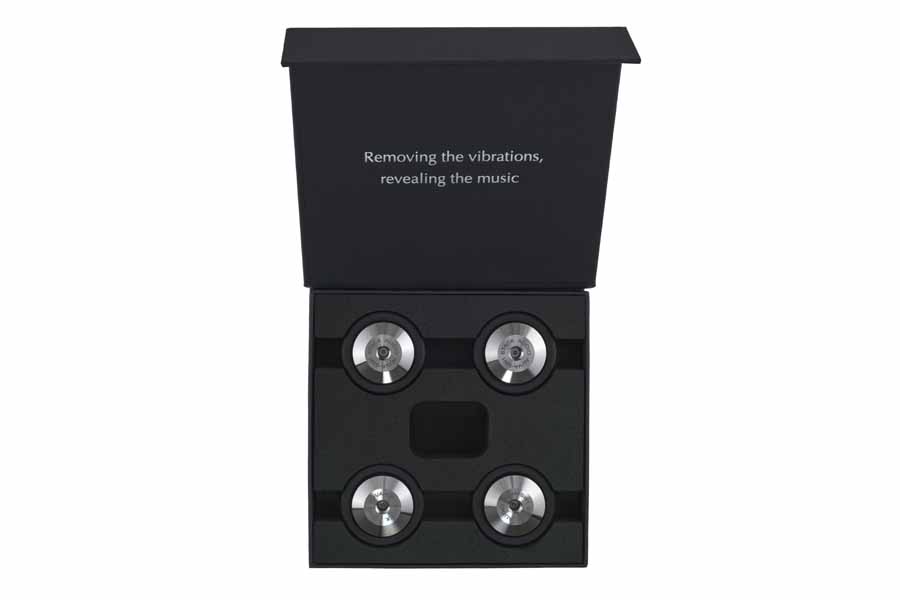 Each isolator incorporates an AUVA particle impact damping chamber inside an aluminium pod. The chamber contains a tuned mass of particles designed to absorb and disperse vibration as heat, addressing both direct and reflected energy from the subwoofer cabinet.