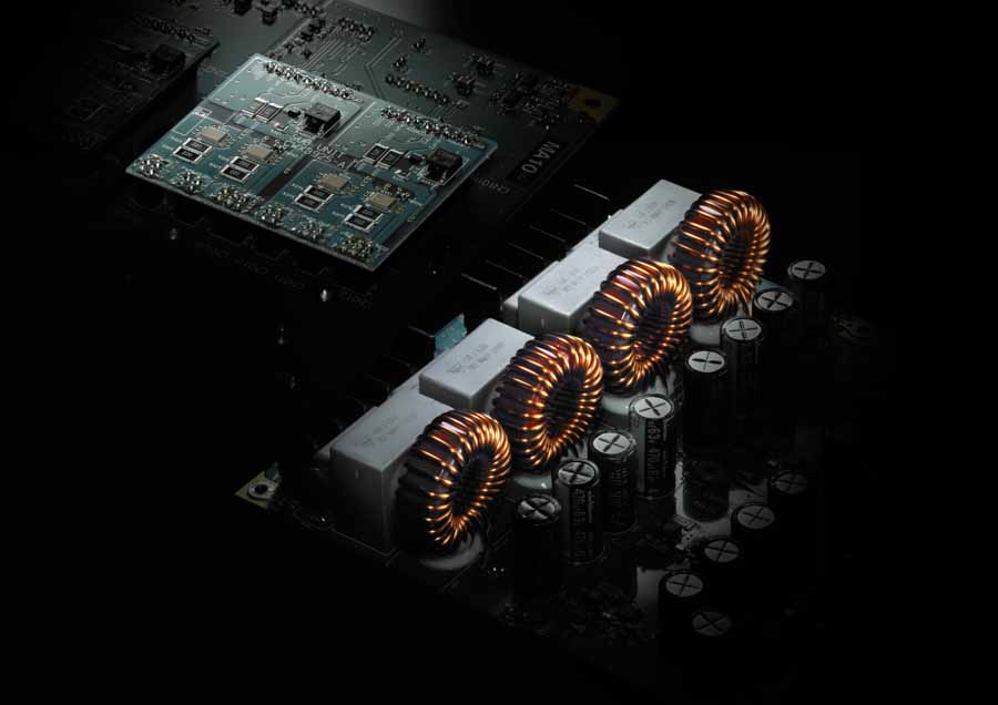 A high-capacity toroidal transformer works with a linear regulator, with its internal coils connected directly to the power supply circuit to reduce contact points. Copper components with non-magnetic coatings are used throughout the power supply section. The transformer core employs a circular cross-section designed to reduce flux leakage and vibration. This supply feeds the preamplifier, power amplifier and control circuits.