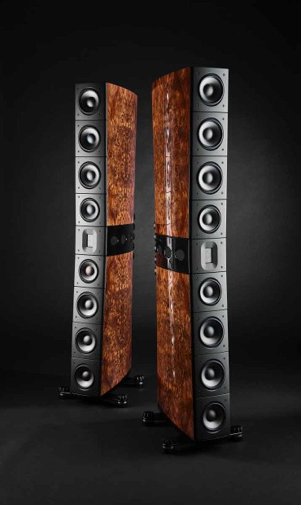 The new 8MM Audiolab LINGA speakers have two-metre tall cabinets and feature an updated OS horn waveguide, ten ultra-low distortion drivers and a passive crossover.