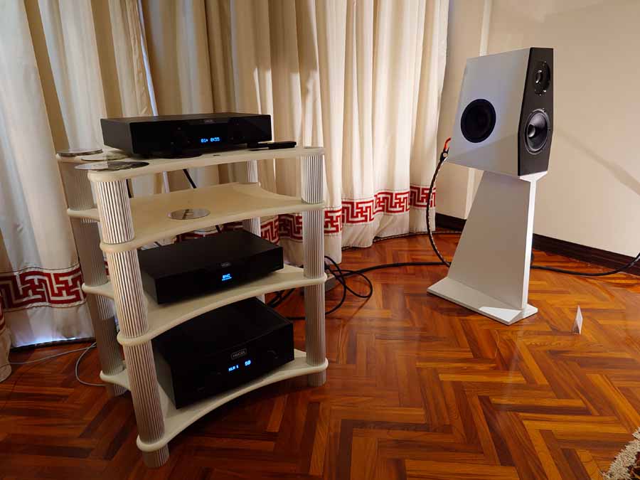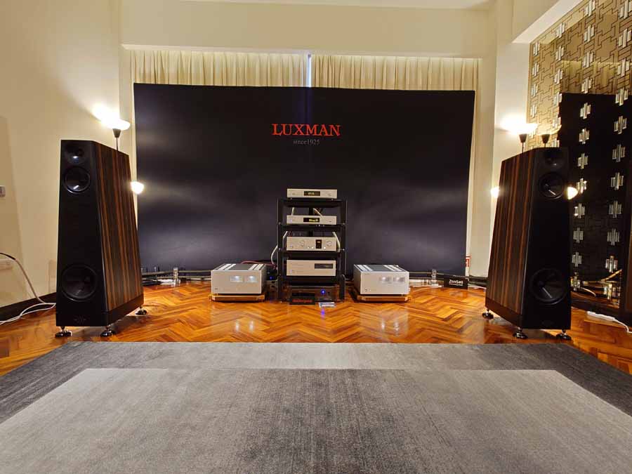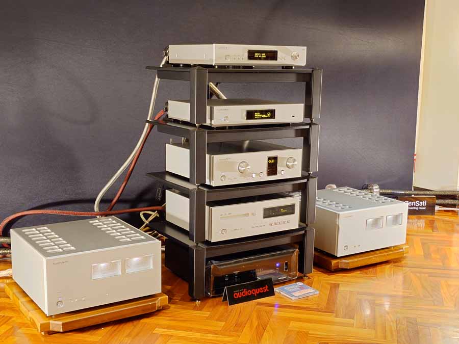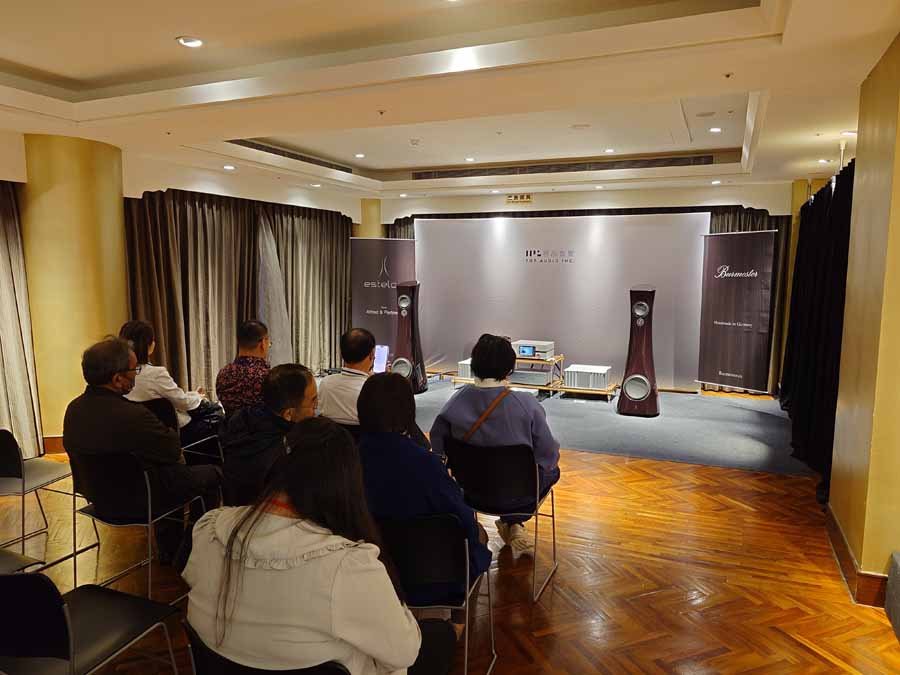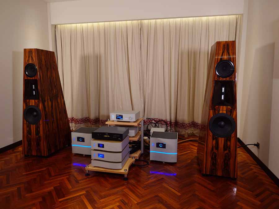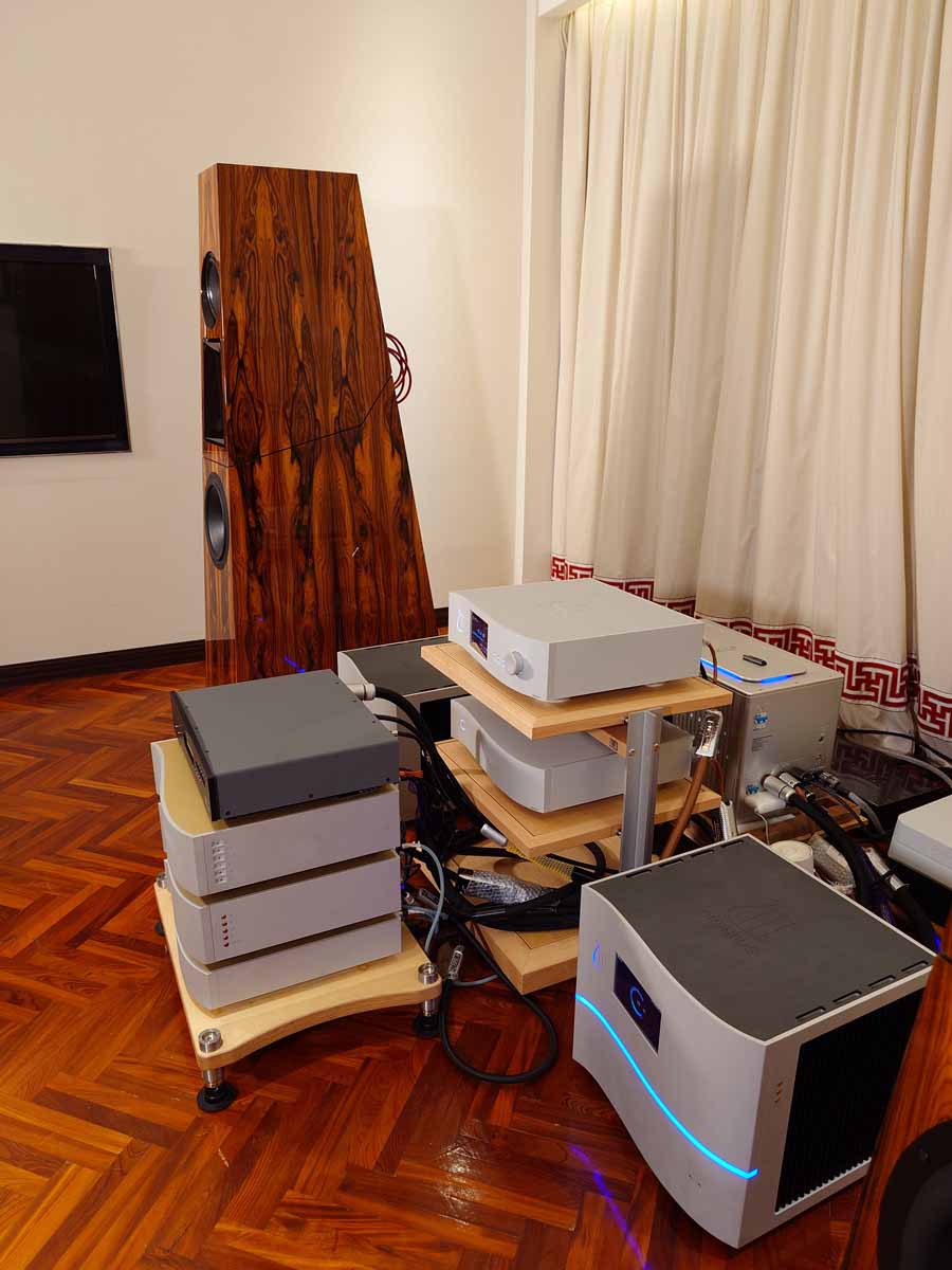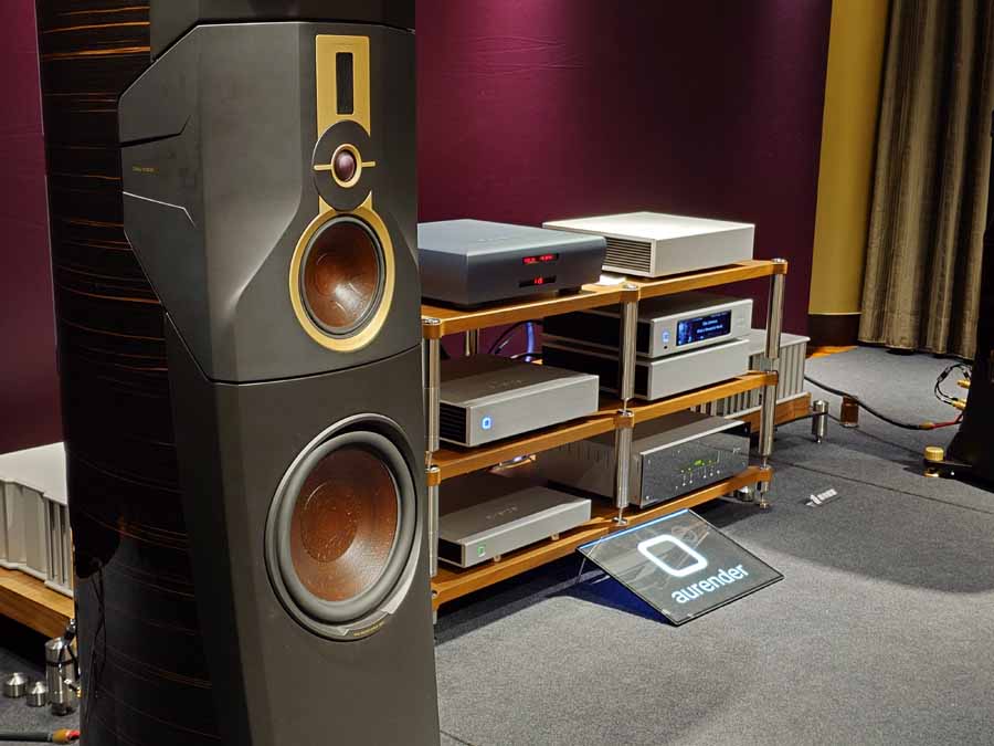 The first system was headed by Estelon’s X Diamond Signature Edition in that wonderfully understated “almost black” dark‑violet finish, which suited the Grand Hotel’s moody lighting down to the ground. Limited to just twenty pairs worldwide, this Signature Edition takes the already serious X Diamond platform to its most rarefied level, with upgraded crossover parts and Accuton’s diamond tweeter doing treble duties. In Taipei, it was paired with Burmester’s 111 Music Centre as the main digital device, two of the newest 218 power amplifiers, and the 948 power conditioner, all placed on a Montaudio Manuka reference rack, with a PureTek Alpha optically isolated network switch and Siltech Royal Double Crown cables ensuring the sound quality matched the pristine aesthetics.