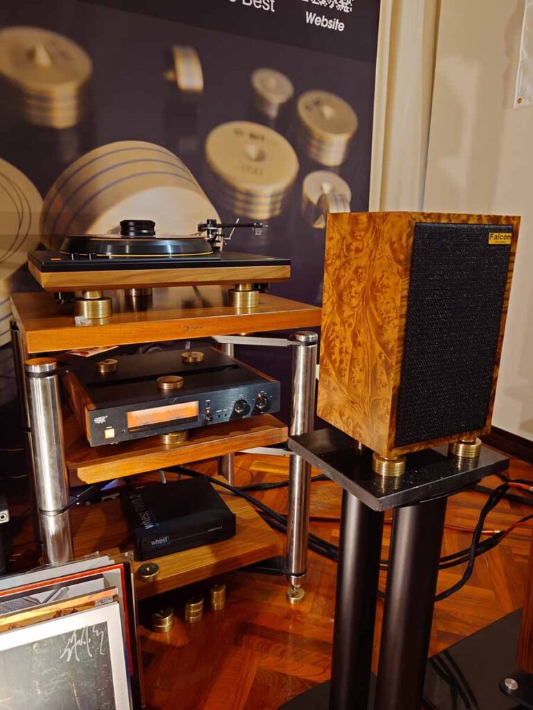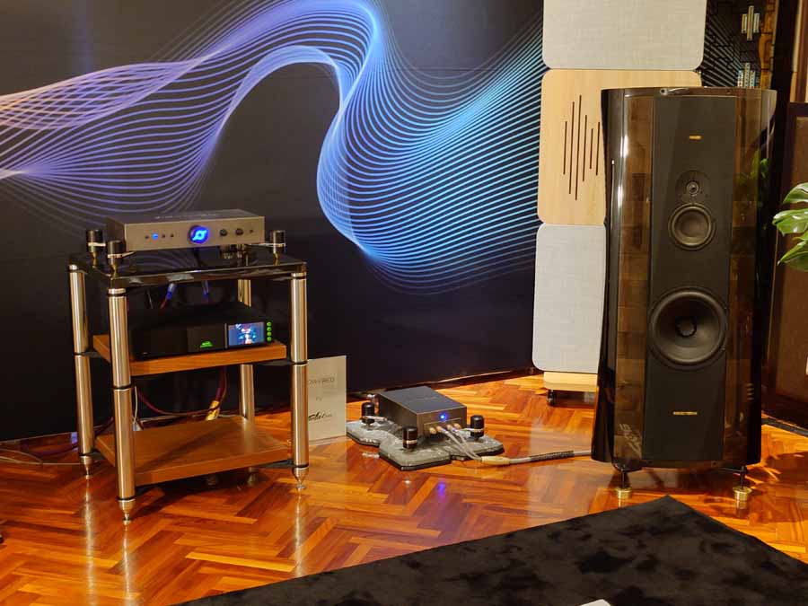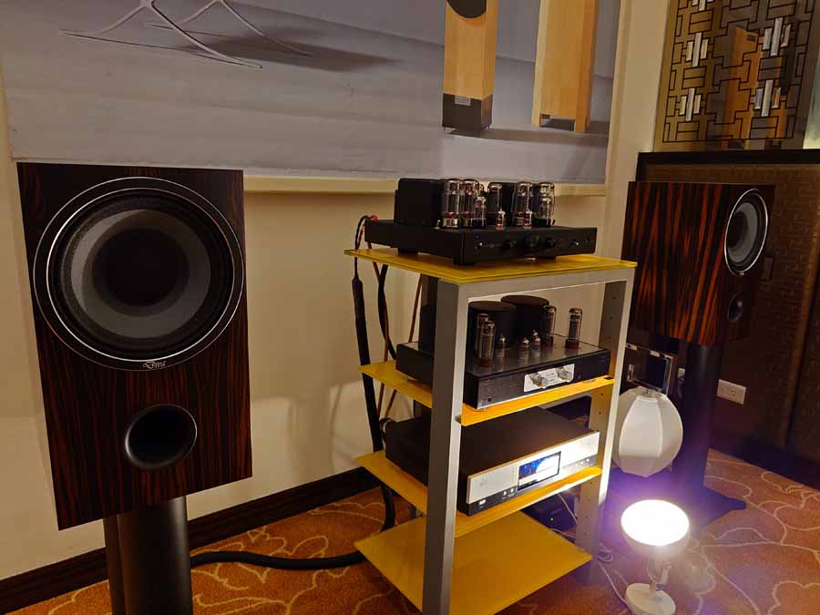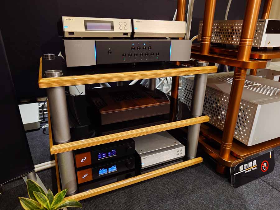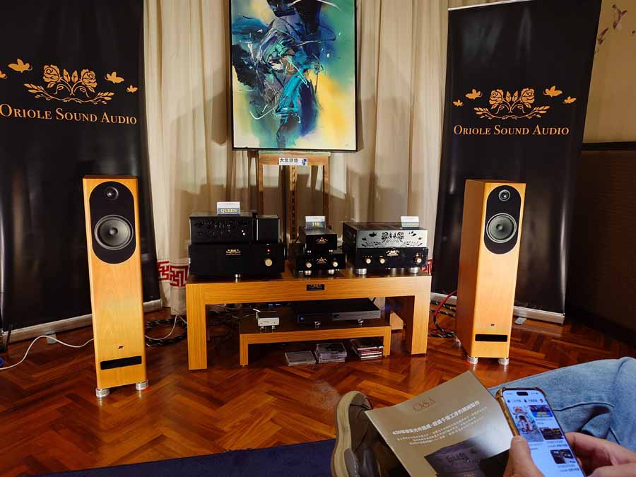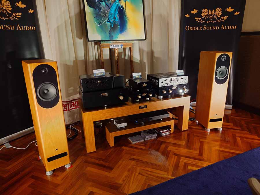 Entering room 203 felt like stepping into a seasoned audiophile recluse’s den. Speakers were refined connoisseurs’ favourites – JMR’s Euterpe Jubilé slim transmission‑line towers, playing with the poise and nuance of a well‑aged Bordeaux Premier Cru. Supporting them, Taiwanese Oriole Sound Audio brought full “they don’t build them like they used to” energy: NOS valves and parts, meticulous point‑to‑point wiring, hand‑wound transformers, exotic materials and just enough mad‑scientist charm, all channelled into very reserved black boxes. Two of their newer creations were in rotation: the Seasonsong integrated, based on 7591 tubes (around 30 W), and the OSA‑8P Queen KT88 push‑pull power amp (about 50 W), fronted by the very linear S310 JFET preamp. A Lyngdorf CD player and Limetree network streamer handled digital duties, while everything sat on Taiwanese HLJ Wavelle Mini Maglev‑2 feet – a neat, earthquake‑savvy touch that also kept the presentation clean, calm and locked‑in.