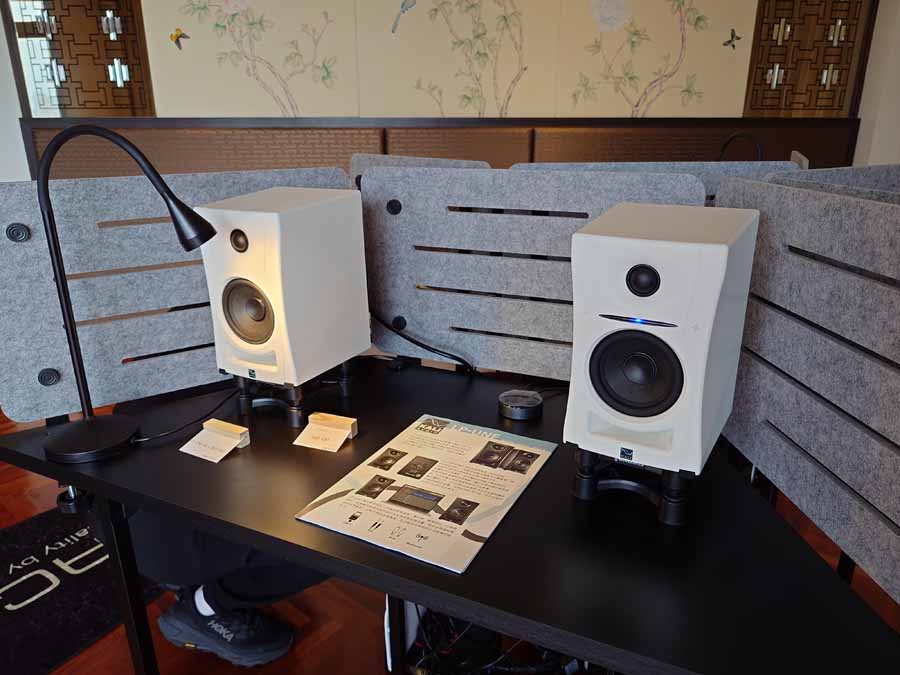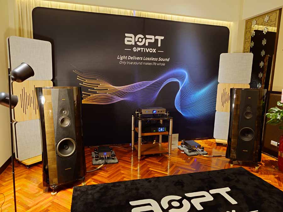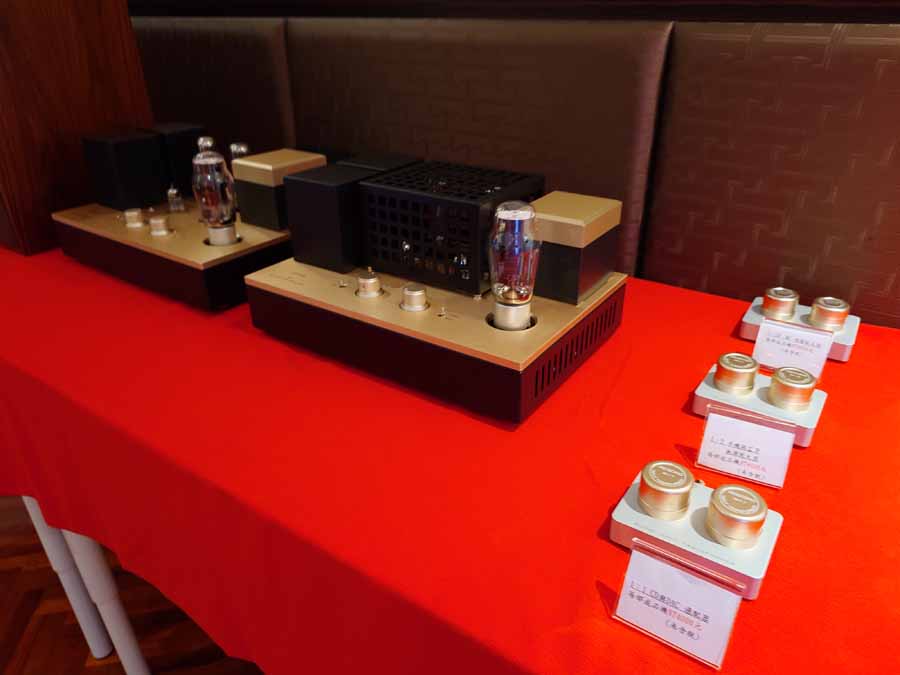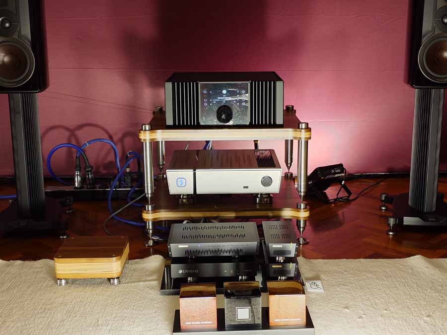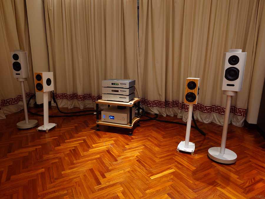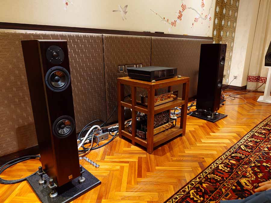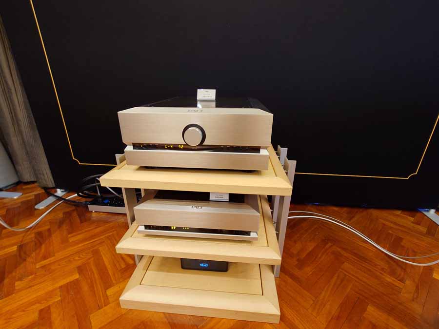 Entering room 203 felt like stepping into a seasoned audiophile recluse’s den. Speakers were refined connoisseurs’ favourites – JMR’s Euterpe Jubilé slim transmission‑line towers, playing with the poise and nuance of a well‑aged Bordeaux Premier Cru. Supporting them, Taiwanese Oriole Sound Audio brought full “they don’t build them like they used to” energy: NOS valves and parts, meticulous point‑to‑point wiring, hand‑wound transformers, exotic materials and just enough mad‑scientist charm, all channelled into very reserved black boxes. Two of their newer creations were in rotation: the Seasonsong integrated, based on 7591 tubes (around 30 W), and the OSA‑8P Queen KT88 push‑pull power amp (about 50 W), fronted by the very linear S310 JFET preamp. A Lyngdorf CD player and Limetree network streamer handled digital duties, while everything sat on Taiwanese HLJ Wavelle Mini Maglev‑2 feet – a neat, earthquake‑savvy touch that also kept the presentation clean, calm and locked‑in.