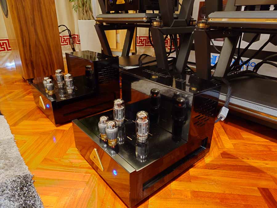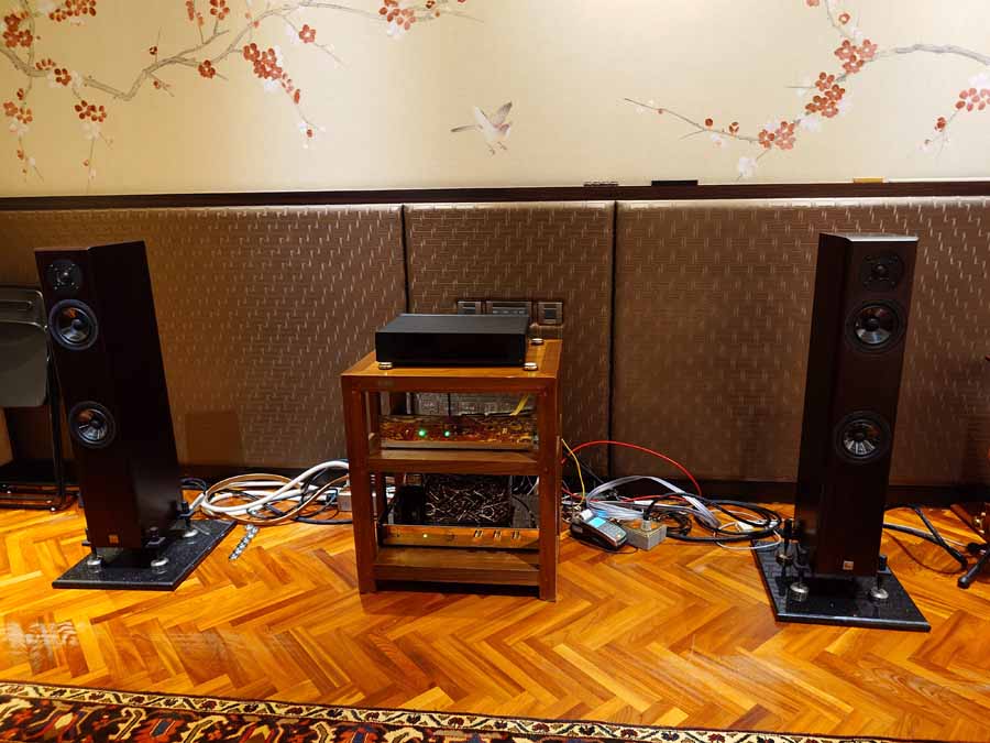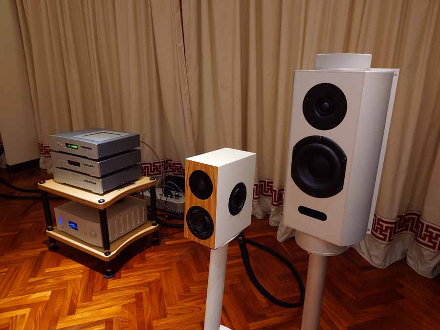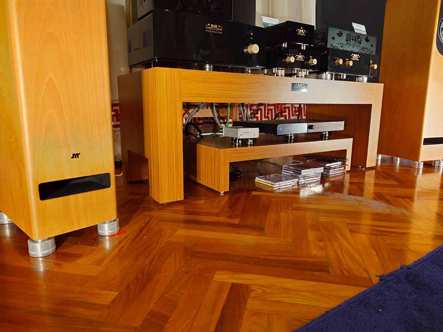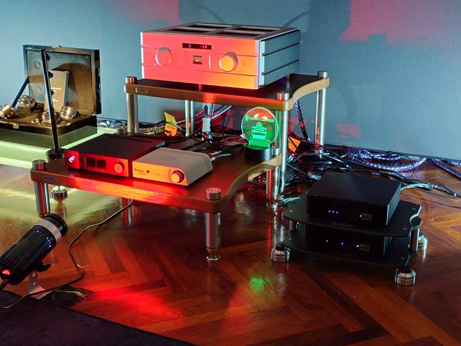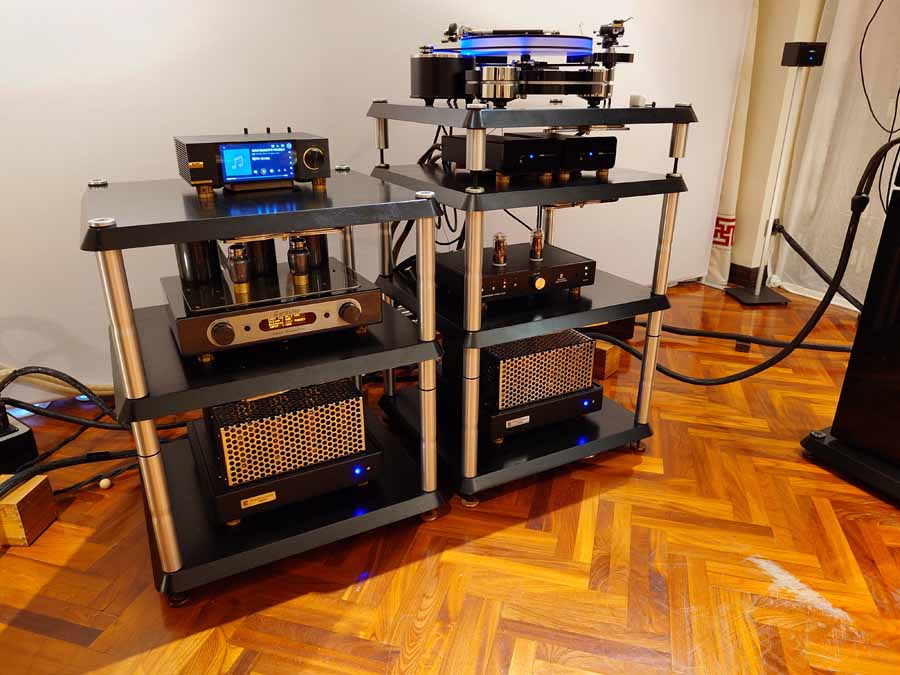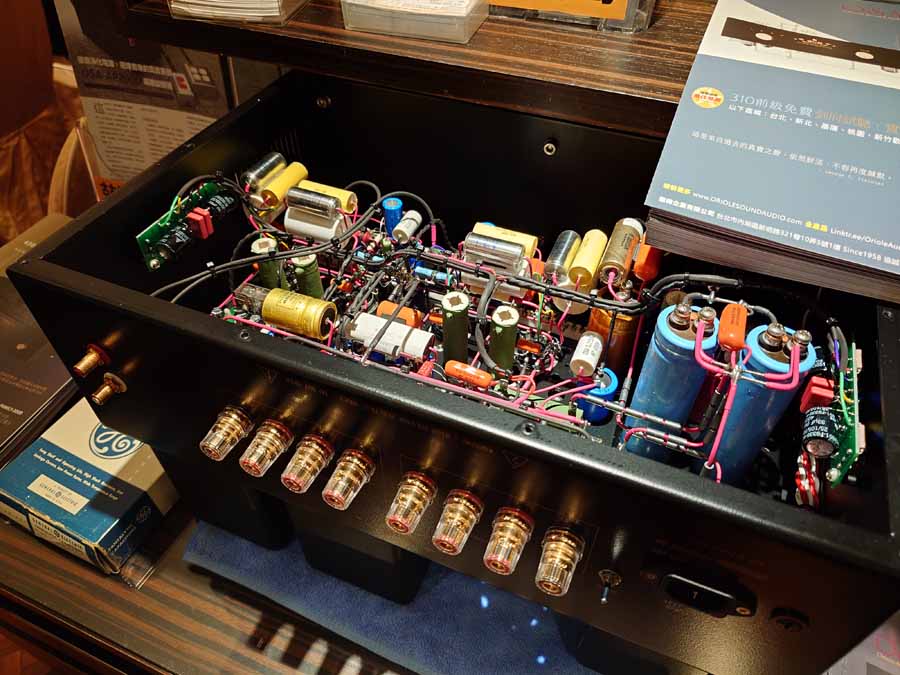 Entering room 203 felt like stepping into a seasoned audiophile recluse’s den. Speakers were refined connoisseurs’ favourites – JMR’s Euterpe Jubilé slim transmission‑line towers, playing with the poise and nuance of a well‑aged Bordeaux Premier Cru. Supporting them, Taiwanese Oriole Sound Audio brought full “they don’t build them like they used to” energy: NOS valves and parts, meticulous point‑to‑point wiring, hand‑wound transformers, exotic materials and just enough mad‑scientist charm, all channelled into very reserved black boxes. Two of their newer creations were in rotation: the Seasonsong integrated, based on 7591 tubes (around 30 W), and the OSA‑8P Queen KT88 push‑pull power amp (about 50 W), fronted by the very linear S310 JFET preamp. A Lyngdorf CD player and Limetree network streamer handled digital duties, while everything sat on Taiwanese HLJ Wavelle Mini Maglev‑2 feet – a neat, earthquake‑savvy touch that also kept the presentation clean, calm and locked‑in.