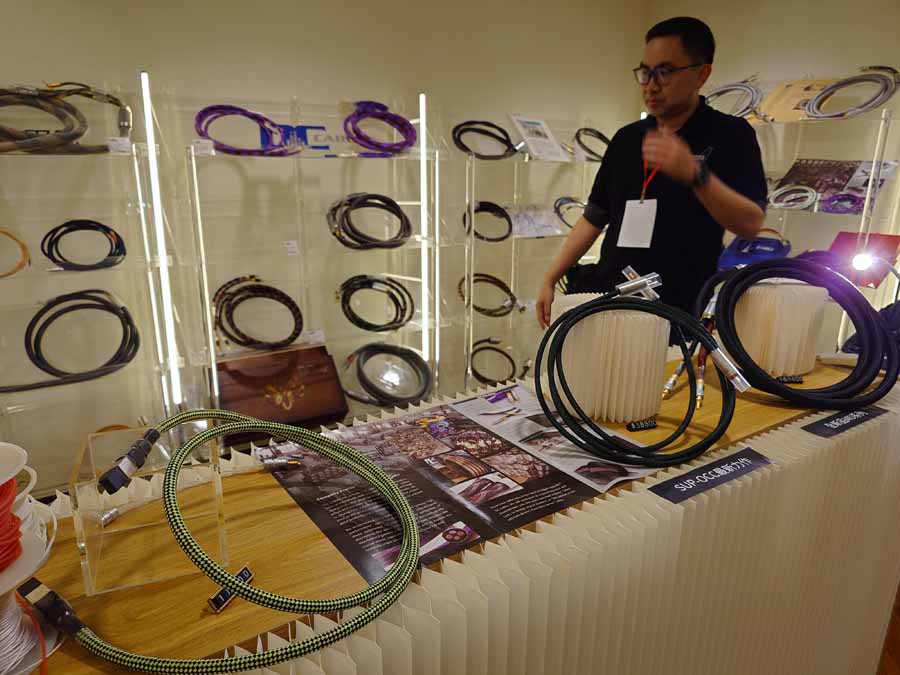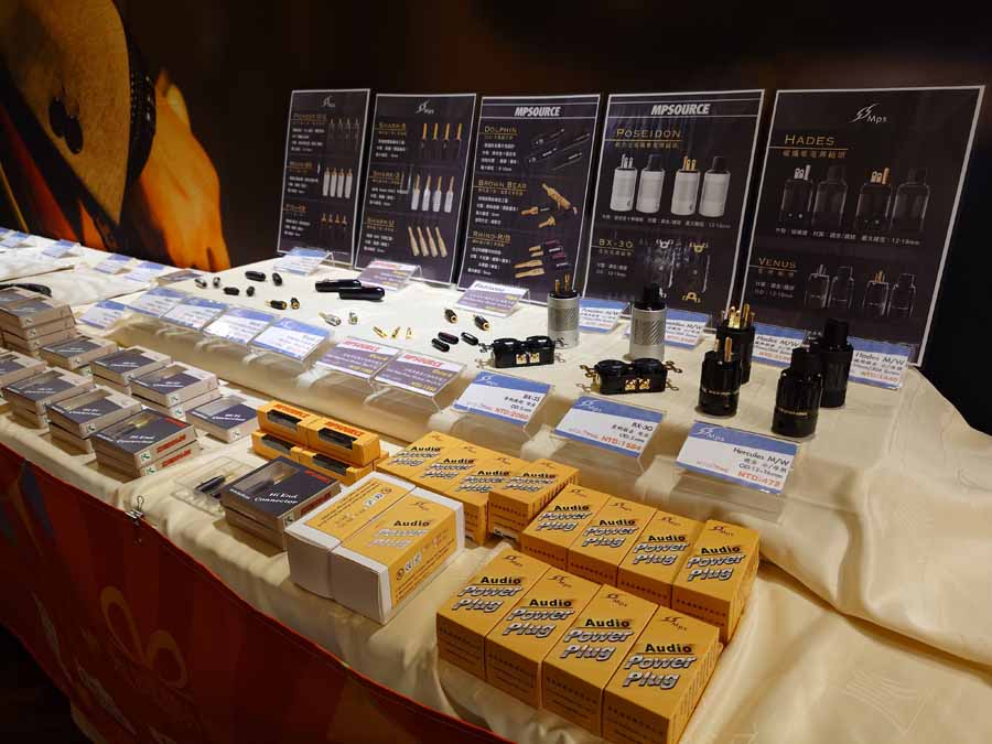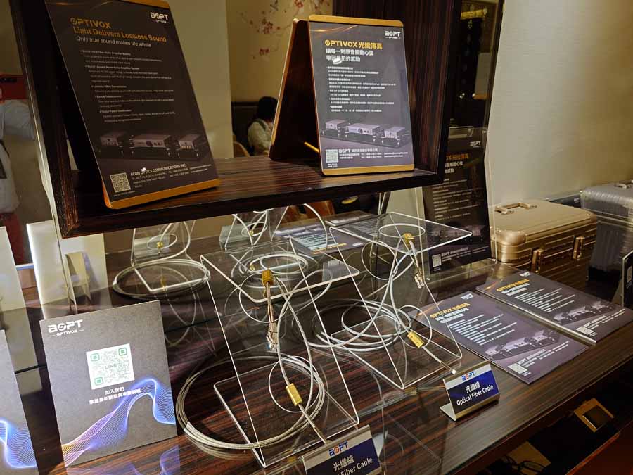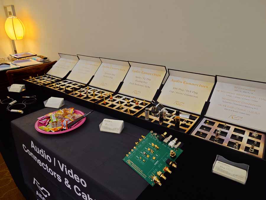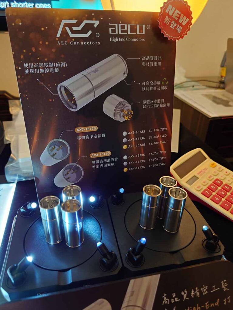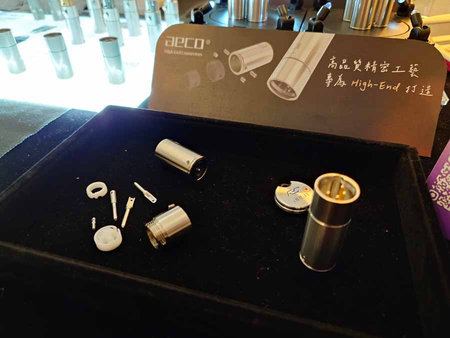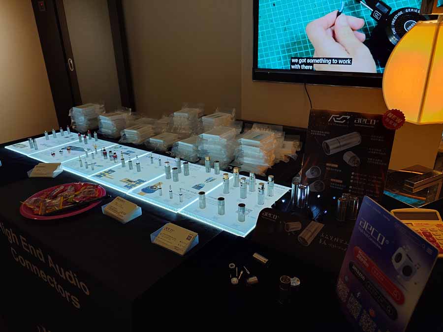 Room 218 was connector‑geek heaven, hosted by Taiwanese specialist AECO. Laid out under glowing light panels were rows of high-end RCA, XLR, BNC, speaker, and RF connectors, PTFE insulators, and beautifully machined metal shells. The focus this year is on their new flagship 3‑ and 4‑pin XLR connectors, with stainless‑steel shells, modular construction that can be fully disassembled, and very tight mechanical tolerances for precise, stable contact.