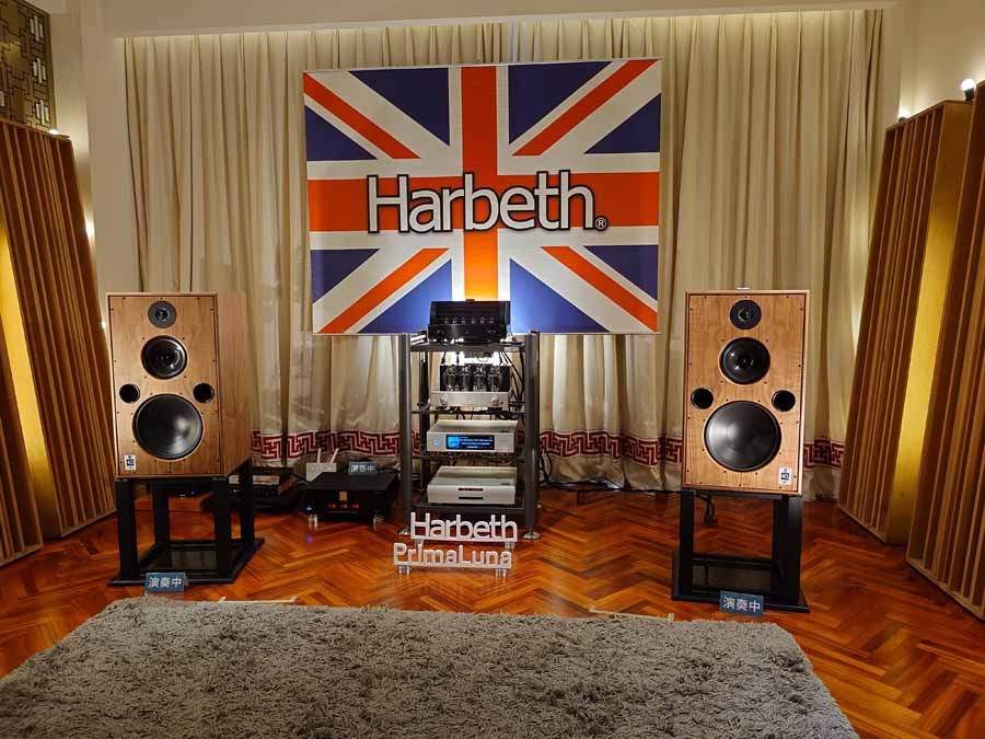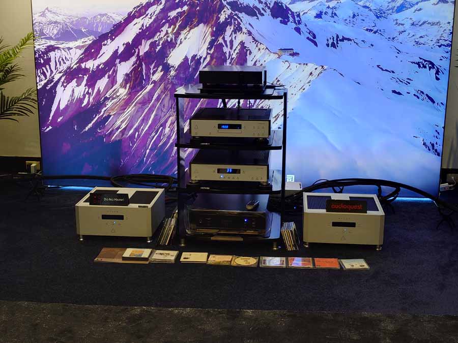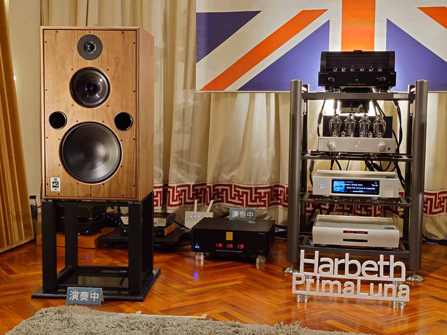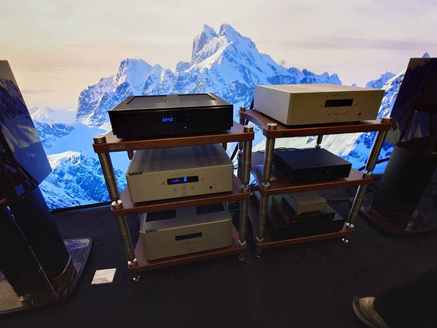 This was one of those rare rooms where “reporting” quietly turned into just sitting and enjoying music. Harbeth’s new Monitor 40.5 XD2s were doing the heavy lifting, those big three-ways on sturdy stands throwing out an easy, full-range sound that never shouted yet filled the room with ease. The amplification came from PrimaLuna valve integrateds (the EVO 300 and EVO 400 took turns), which added a little glow and liquidity without losing detail. The source was an Aurender N20 network transport paired with a Playback Designs MPD DAC. Everything was neatly arranged on an Artesania HiFi rack. It was a well-thought-out, no-nonsense chain that let the Harbeths breathe and made it hard to leave the sweet spot.