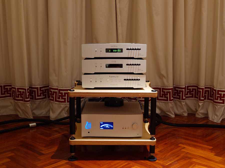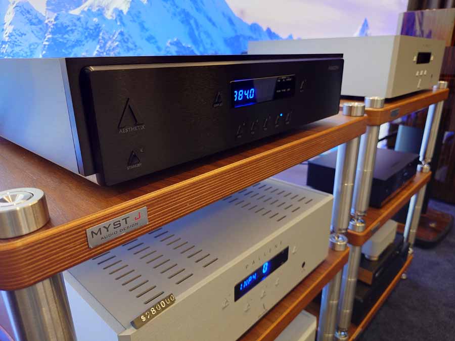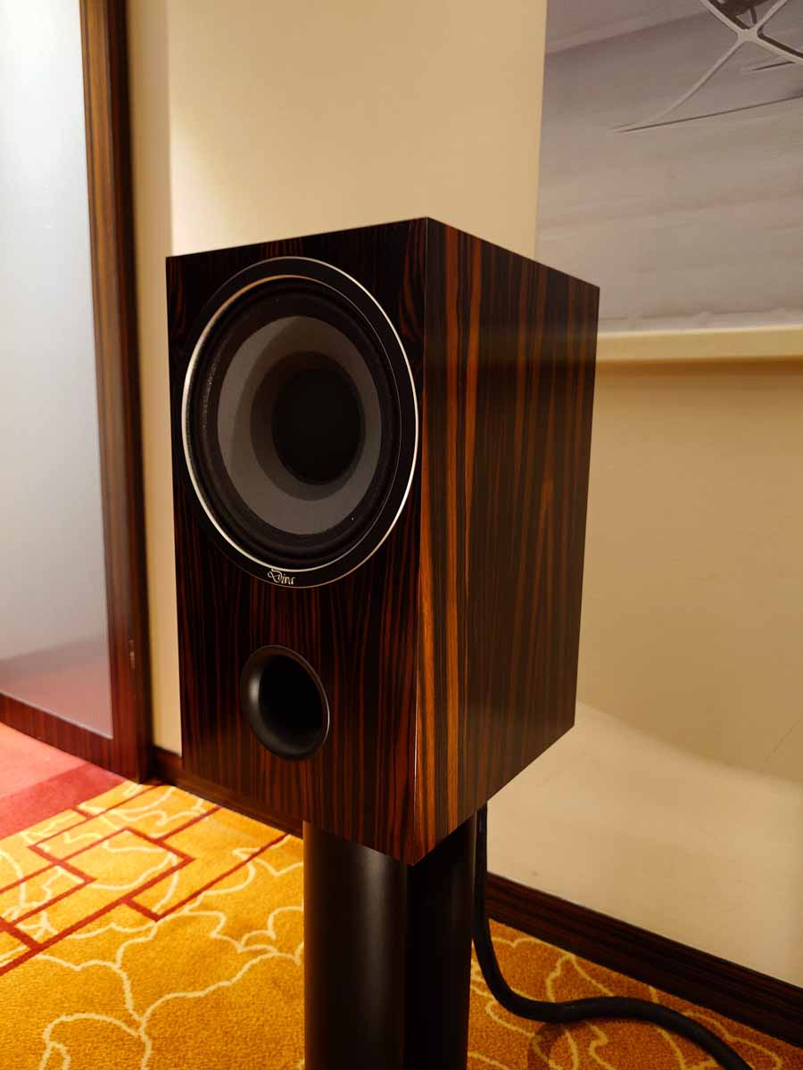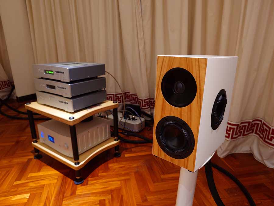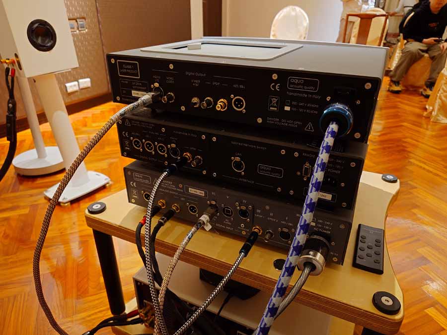 In the adjoining room things scaled down physically but stayed firmly in high‑end territory, with Kaiser’s tiny Colibri mini monitors doing the honours – little Panzerholz boxes that sound far bigger than they look. They were driven by an Orpheus Absolute integrated amplifier fronted by Aqua’s Formula DAC, LinQ network bridge and La Diva CD transport, a compact stack that kept the presentation clean, fluid and surprisingly full‑bodied for such modest‑sized speakers.