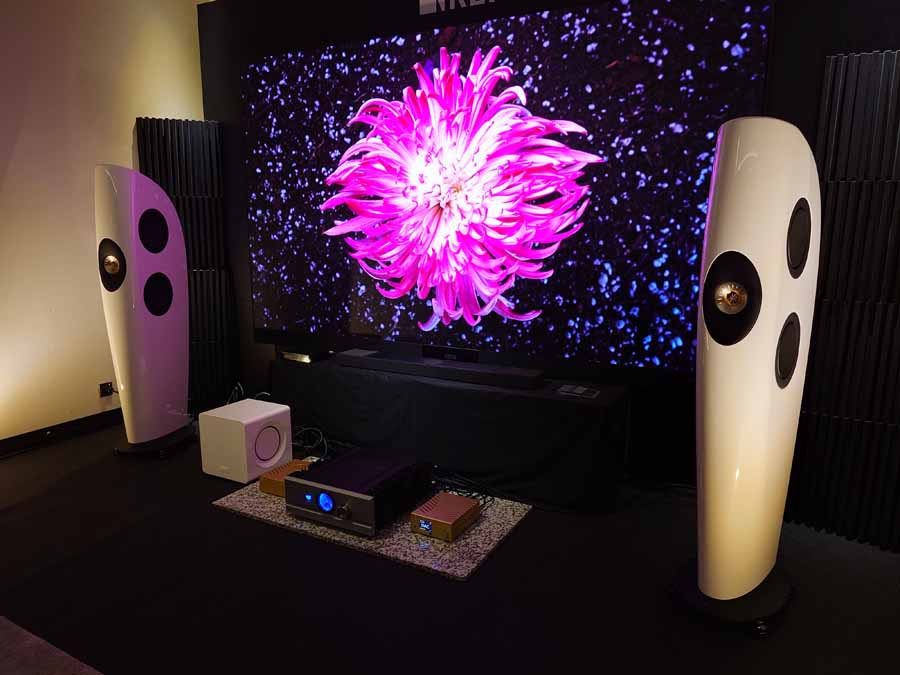 KEF’s Blade One Meta paired with Pass Labs’ INT‑60 made for a bit of a “greatest hits” system, with the Gold Note DS‑10 EVO on streaming duty and an Optoma projector proving how a modest room can still be a fully convincing 2.1 home cinema. The big Blades still threw a wide, precise soundstage for music, yet never felt over the top for film use. Around the room, Argon Audio gear and other KEF speakers showed more down‑to‑earth options for when the Blade fantasy has to meet real‑world budgets and spaces.