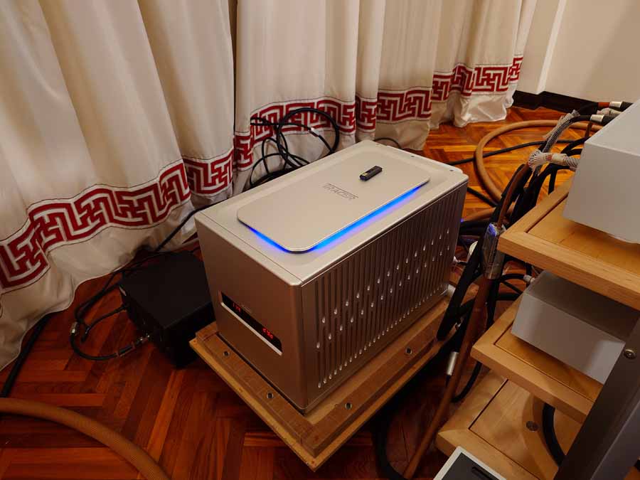 Electronics duty was handled by Matrix Audio’s new MS‑1 network player into the MP‑1 preamp and MA‑1 power amp, giving a full in‑house digital‑to‑speaker chain that stayed resolutely in the black finish while the speakers did the furniture‑porn bit. Upstream, a Dela (formerly known as Melco) N5 music server and matching S‑series network gear fed the streamer, while a Stromtank S2500 Mk2 battery power conditioner squatted on the floor like a very expensive white subwoofer, quietly keeping the AC out of the picture. It was an intriguing mix of old‑school proportions and thoroughly modern digital infrastructure, and the room had exactly that “big, relaxed, grown‑up” sound the visuals promised.